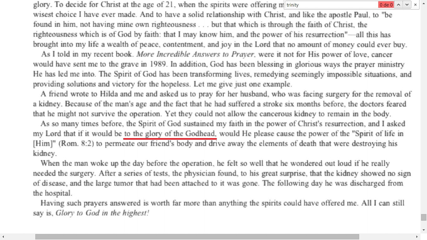 [Nota de Esclarecimento. Segue a comprovação de má fé na tradução tendenciosa e trinitariana da Casa Publicadora Brasileira. Veja o texto original: “A so many times before, the Spirit of God sustained my faith in the power of Christ’s resurrection, and I asked my Lord that if it would be to the glory of the Godhead, would He please cause the power of the “Spirit of lif in [Him]” (Rom. :2) to permeate our friend’s body and drive away the elements of death that were destroying his kidney.”