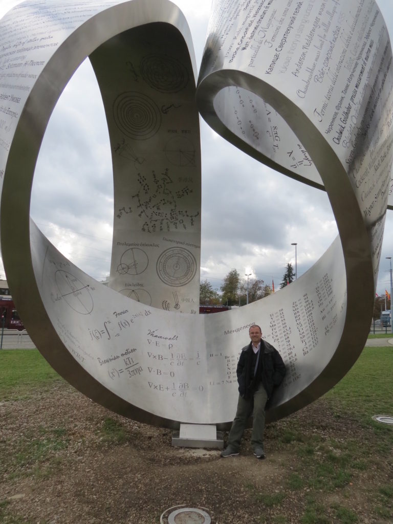 E o “quem” por trás desse trabalho monumental? Gayle Hermick é formado em Belas Artes pela Universidade de Manitoba, no Canadá. Ela gravitou em formas esculturais em barro. Metal foi uma evolução natural. Ela é tolerante com minha persistência e generosa com seu tempo, dando respostas honestas e elegantes às minhas perguntas. Pergunto-lhe como ela ganhou a comissão pelo trabalho. Ela responde: “Não foi uma comissão. Eu lancei a ideia de uma escultura no site depois de visitar o Grande Colisor de Hádrons, então em progresso. Eu não visitei o CERN com formação em física ou matemática. A dança para criar a escultura certa envolveu muita pesquisa da minha parte e alguns para lá e para cá com o CERN para obter mais informações sobre a física de partículas. Percebi rapidamente que eu não tinha conhecimento suficiente sobre física contemporânea para criar um trabalho sobre uma teoria específica, mas também percebi que estava em boa companhia com a maior parte do mundo. Minha escultura cresceu naturalmente a partir deste ponto. Eu queria que fosse tanto um monumento ao que foi alcançado quanto para me informar, e espero que outros, sobre como nós, a humanidade, chegamos ao ponto de colidir partículas apenas sob a velocidade da luz para entender o que compõe o nosso universo ”. (Uau!) Ela continua: “Fiquei fascinado com as belas mas impenetráveis equações que acompanham cada artigo que pesquisei”.