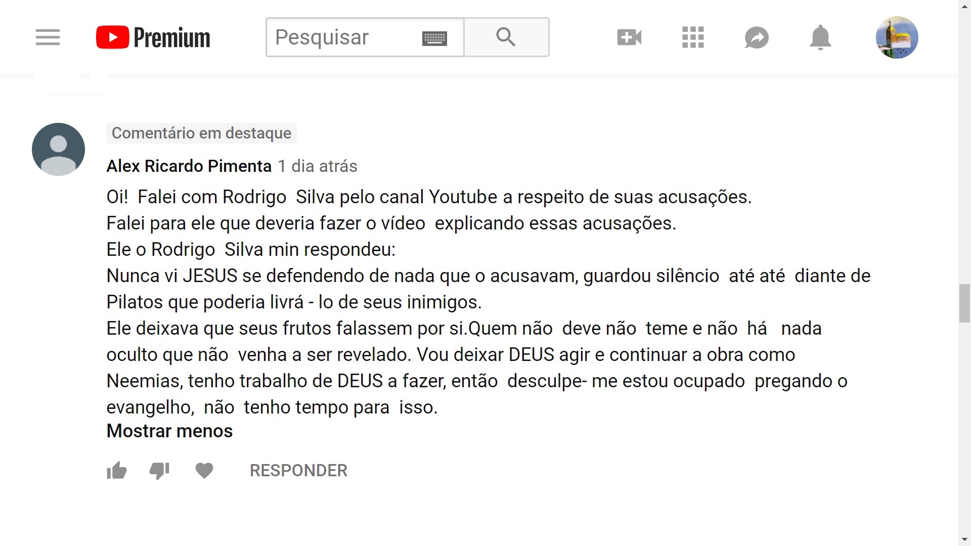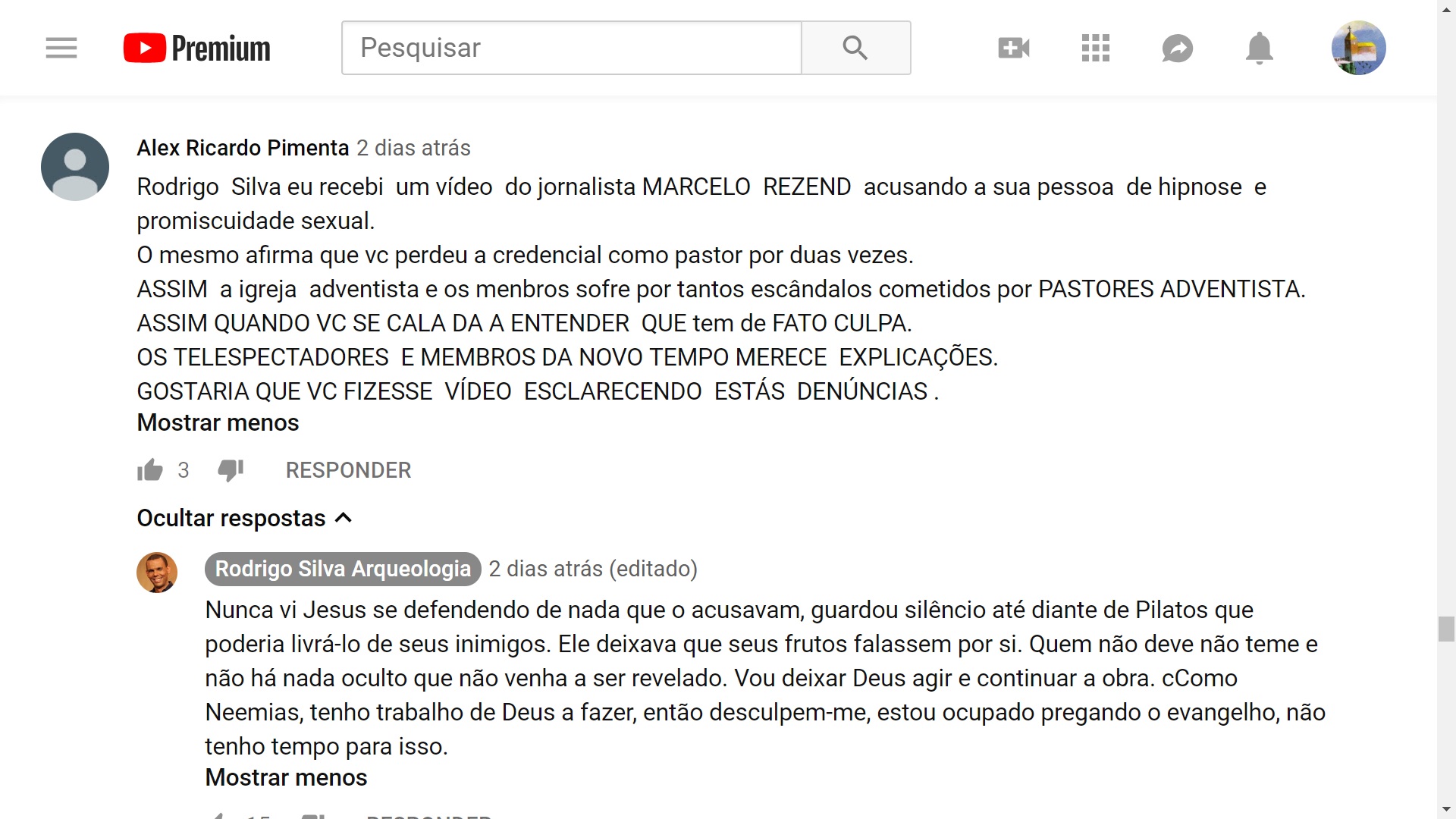 10. Li tudo com atenção. Mas só vi mínimo. Cadê as provas das acusações? Rodrigo Silva é um homem sério. A resposta dele foi coerente de acordo com caráter do verdadeiro cristão. Ele não precisa de se defender pois tem um advogado que é Jesus. Onde estão a fé de vcs? Afinal se ele é errado é lógico que a verdade virá a tona. Deus é justiça se ele errou com ctz pagará. Na questão do vídeo não vi nada de hipnose já havia visto vídeo dele e foi uma simples demonstração. Cadê a moça que ele hipnotizou? Todo mundo quer 15 minutos de fama pisando em cima de quem não merece. Basta ser cristão para ser alvo de satanás. A igreja de Deus não é a igreja adventista mas! Aqueles que conhece e guardam os mandamentos de Deus. Isso a igreja prega mas nem todos fazem. Assim como nas outras. O problema é que, a igreja tem sido alvo do diabo. Jesus está voltando e satanás está desesperado em seus últimos momentos de existência. Por isso tem atacado de todos os lado e formas para destruir o remanescente de Deus.