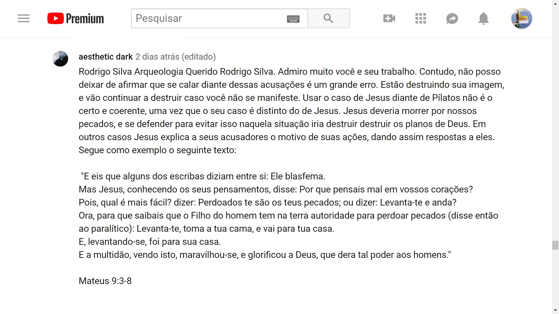 Rodrigo Silva Arqueologia Querido Rodrigo Silva. Admiro muito você e seu trabalho. Contudo, não posso deixar de afirmar que se calar diante dessas acusações é um grande erro. Estão destruindo sua imagem, e vão continuar a destruir caso você não se manifeste. Usar o caso de Jesus diante de Pílatos não é o certo e coerente, uma vez que o seu caso é distinto do de Jesus… [Veja a íntegra nos prints de tela abaixo.]