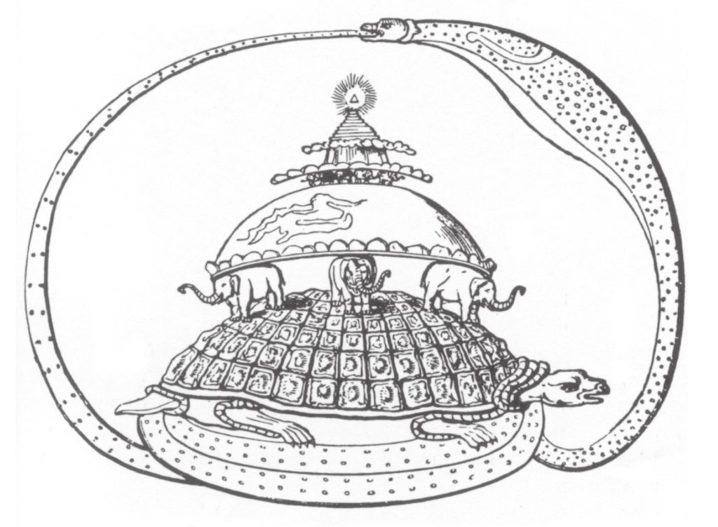 “A imagem acima mostra um dos conceitos hindus do Universo. A Terra, chamada por eles de Monte Meru, e as regiões infernais eram transportadas por uma tartaruga, símbolo da força e poder criativo. Por sua vez, a tartaruga repousava sobre a grande serpente, que era o emblema da eternidade. Existiam três mundos: a região superior era a residência dos deuses, a região intermediária era a Terra e a região inferior era a região infernal. Eles acreditavam que o Monte Meru cobria e unia os três mundos. No topo do Monte Meru estava o triângulo, o símbolo da criação. As estrelas giravam em volta da montanha cósmica Meru.” Cosmologia da Origem do Universo (2015) Observatório Nacional — Ministério da Ciência e da Tecnologia, pág. 24.
