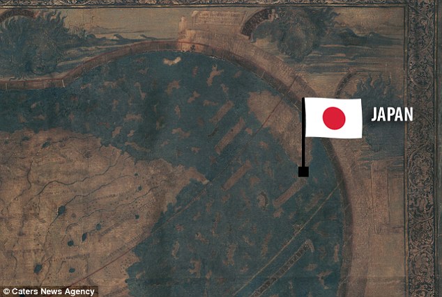 Até agora, os especialistas revelaram centenas de nomes de lugares e mais de 60 passagens escritas no mapa desbotado. Um deles indica que o Japão (marcado) está posicionado a 1.000 milhas da costa da Ásia