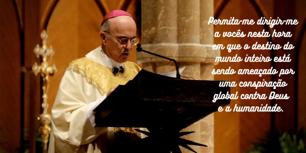 Escrevo-lhe como Arcebispo, como Sucessor dos Apóstolos, como ex-Núncio Apostólico nos Estados Unidos da América. Estou escrevendo para você em meio ao silêncio das autoridades civis e religiosas. Aceite estas minhas palavras como a “voz do que clama no deserto” (João 1, 23).