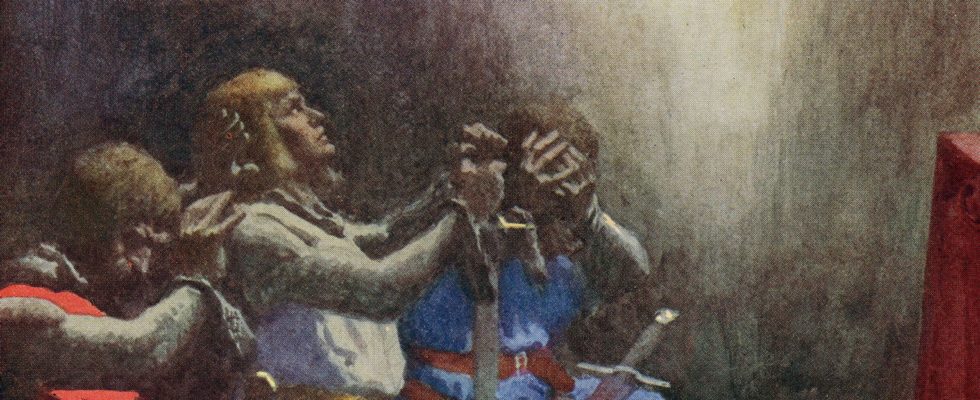 A book illustration from 1918 of Percival, one of King Arthur’s Knights, finding the Holy Grail. — Image by © GraphicaArtis/Corbis