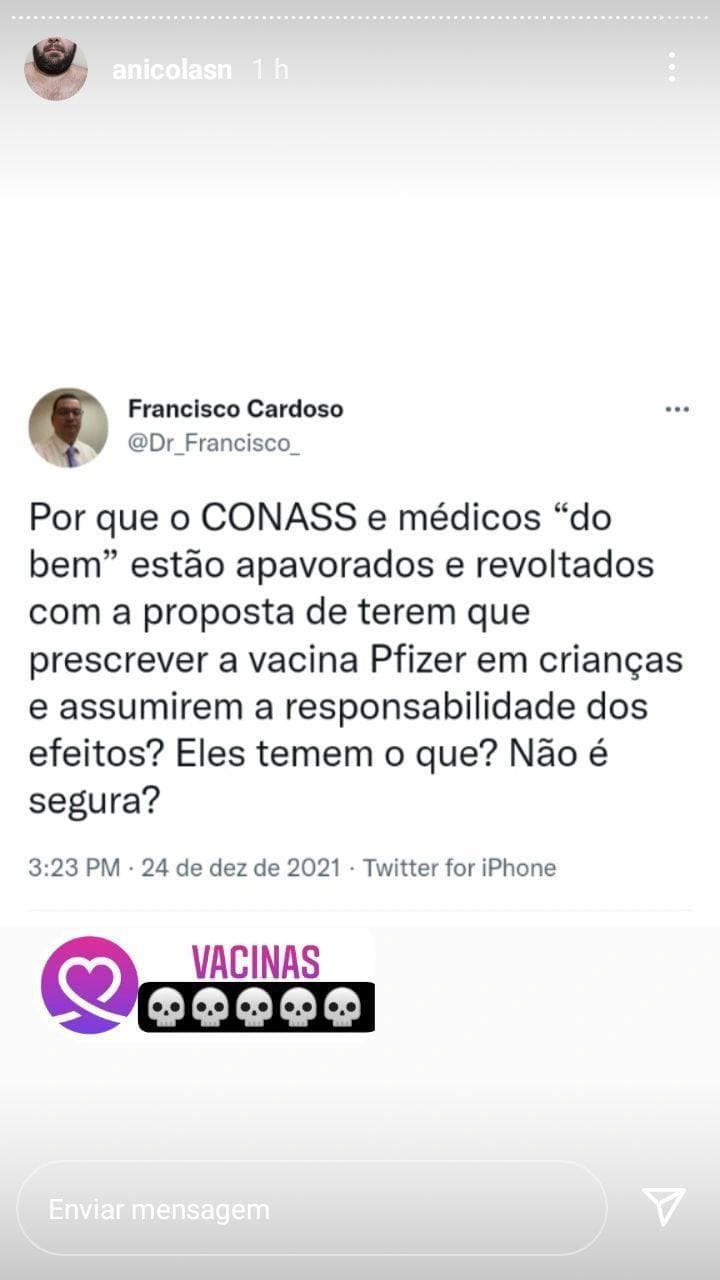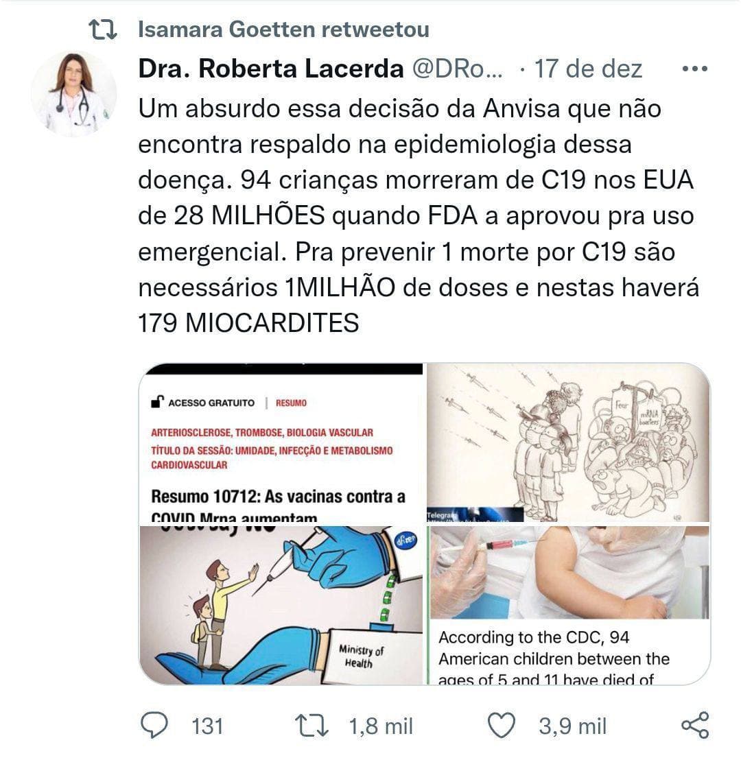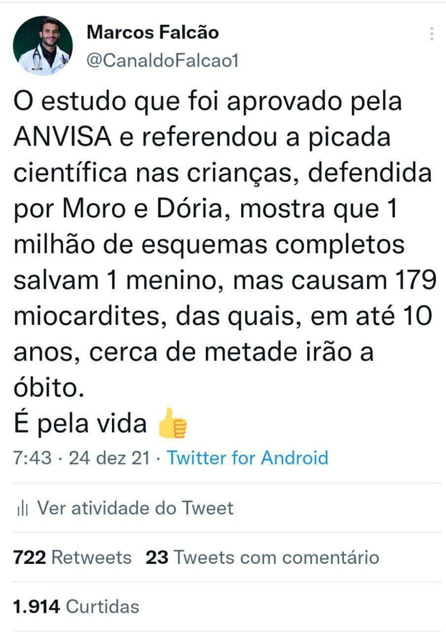 Não é o Presidente Jair Bolsonaro que “quer” prescrição médica para aplicação da vacina Pfizer em crianças. É a ANVISA. Acima em destaque a pág.2 do Parecer Público de Aprovação da Vacina Pfizer para 5-11 anos pela ANVISA. Não gostou? Reclame com o Diretor Barra Torres” — Dr. Francisco Cardoso, do Grupo Médicos pela Vida. No Telegram: t.me/medicospelavida