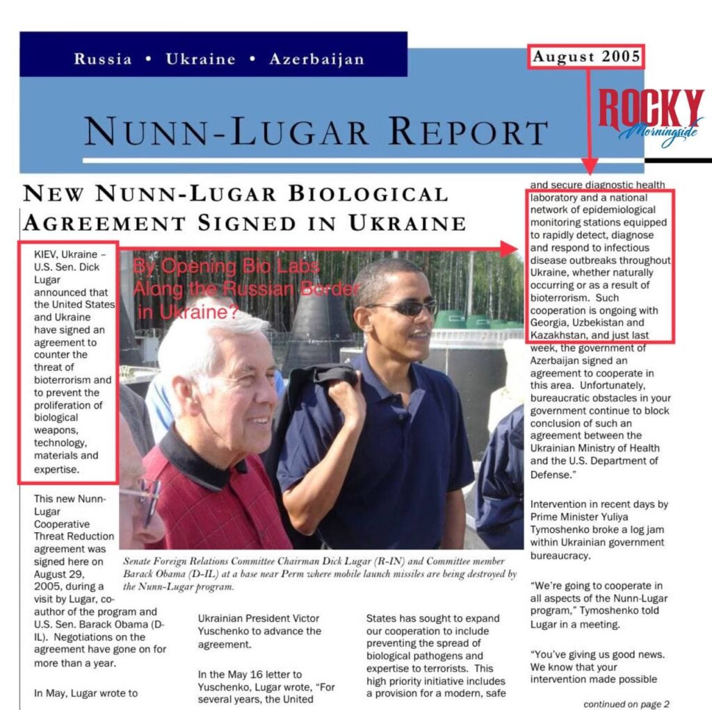 “Lugar disse que os planos para a instalação começaram em 2005, quando ele e o então senador Barack Obama firmaram uma parceria com autoridades ucranianas. Lugar e Obama também ajudaram a coordenar os esforços entre os pesquisadores dos EUA e da Ucrânia naquele ano em um esforço para estudar e ajudar a prevenir a gripe aviária”, explicou a autora Tina Redlup.
