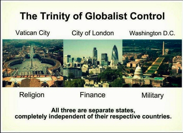 A Trindade do Controlo Globalista: A Cidade do Vaticano (Religião), A Cidade de Londres (Finanças) e Washington D.C. (Militar). TODOS estes 3 são estados separados, completamente independentes dos seus respectivos países.