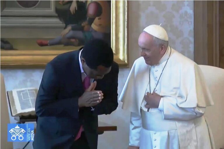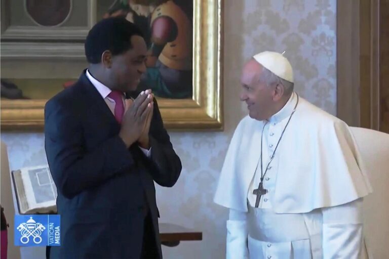 Presidente Hichilema se curvando diante do papa e se se maravilhando após a besta.