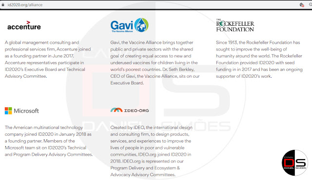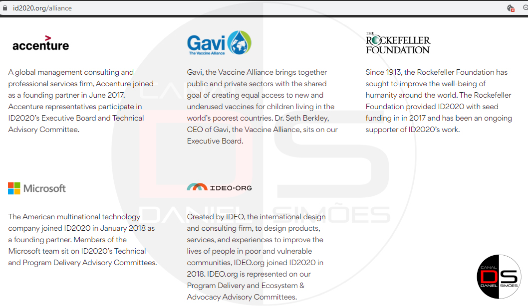 O Programa iD2020 é descrito como “uma convocação anual de empresas do setor privado, governos nacionais, agências da ONU, diversas organizações sem fins lucrativos e membros distintos da academia que se reúnem para explorar os potenciais e os desafios da identidade digital.”… e como “Uma abordagem holística, baseada no mercado e abordando todo o escopo e escala do desafio. Nenhum governo, empresa ou agência pode resolver esse desafio sozinho. Definir o curso futuro da identificação digital e navegar pelos riscos associados é um desafio que requer colaboração sustentada e parceria global.”… afirmando que “A necessidade de uma boa identificação digital é universal. A capacidade de provar quem você é, é um direito humano fundamental e universal. Como vivemos na era digital, precisamos de uma maneira confiável e seguramente fazer isso no mundo físico e online”… e que “Trazendo vida à identidade digital, protegendo a privacidade, portátil e centrada no usuário. O ID2020 suporta programas de identidade digital que melhoram diretamente vidas e geram evidências necessárias de como maximizamos o potencial da identificação digital para todos”… e que “Os parceiros da Aliança compartilham a crença de que a identidade é um direito humano e que os indivíduos devem ter “propriedade” sobre sua própria identidade. Em 2018, os Parceiros da Aliança ID2020, trabalhando em parceria com o Alto Comissariado das Nações Unidas para os Refugiados (ACNUR), elaboraram uma articulação formal de nossa perspectiva sobre abordagens éticas da identidade digital. O marco do Manifesto de Aliança ID2020 (…) estabelece esses princípios compartilhados e constitui um ponto de partida para guiar o futuro da identidade digital globalmente”.