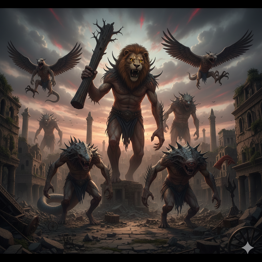 A Bíblia não descreve criaturas híbridas diretamente, mas as culturas antigas estão repletas delas: centauros, sereias, sátiros, esfinges, deuses com cabeça de animal, etc. Essas figuras aparecem:
