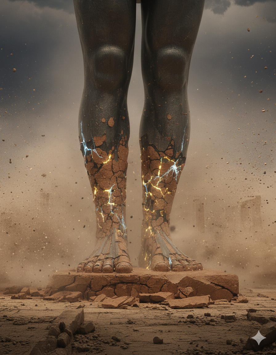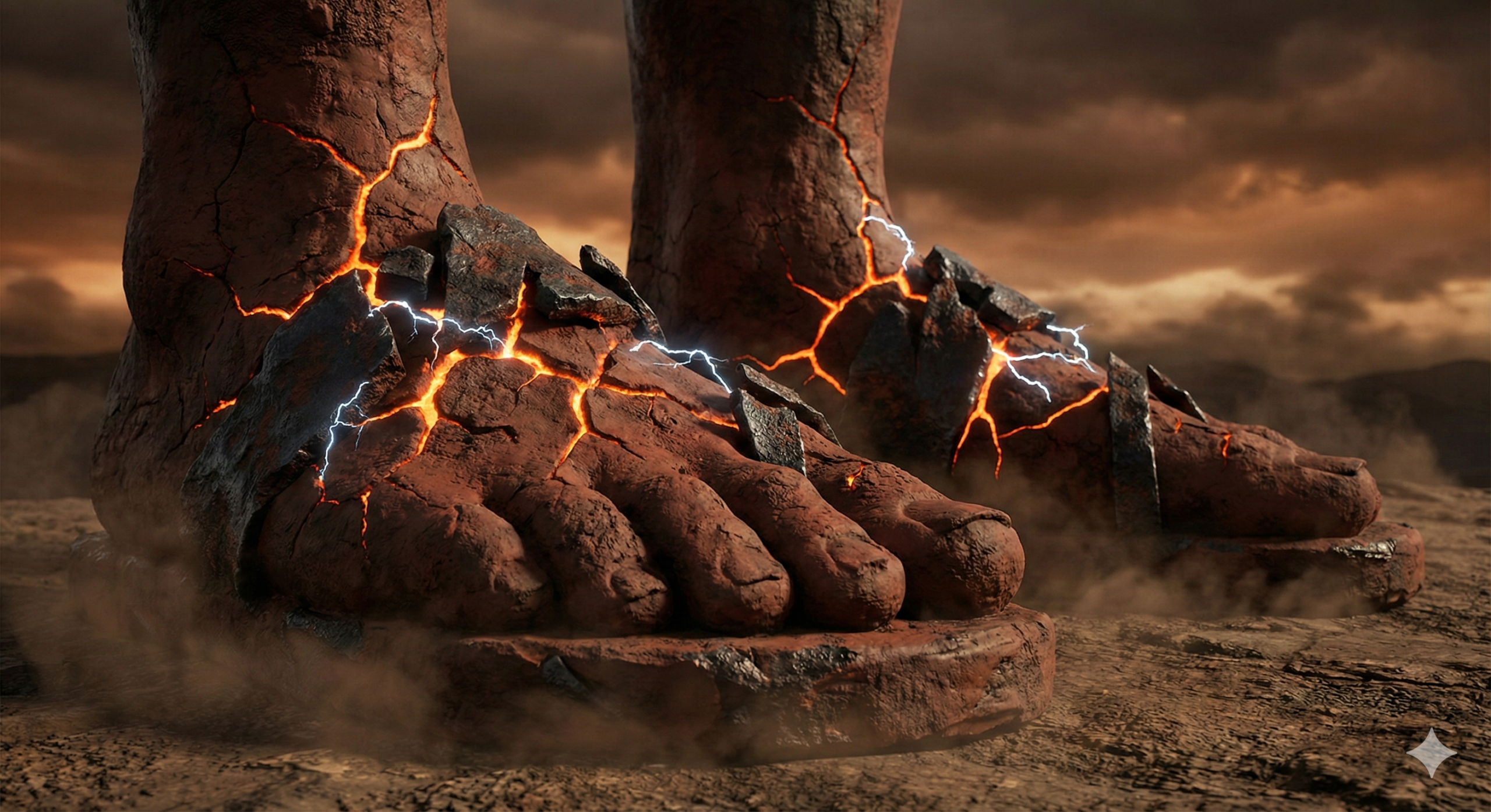 Os pés da estátua não representam apenas divisão política; representam uma tentativa de fusão impossível, uma união antinatural entre barro (o ser humano criado por Deus) e ferro (a tecnologia fria, impessoal, mecanizada e espiritualizada pelas elites modernas).