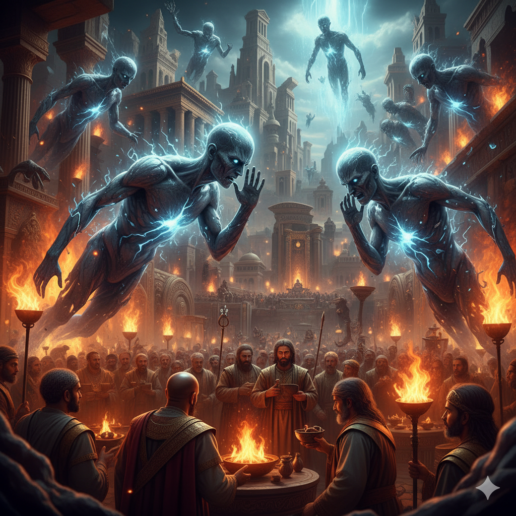 Os espíritos errantes não são anjos caídos. Eles são, sim, os espíritos dos híbridos, os chamados gigantes ou nefilins — seres gerados da união ilícita entre anjos rebeldes e mulheres humanas. Esses híbridos possuíam natureza mista: corpo material herdado da humanidade e essência espiritual derivada de seus pais celestiais.