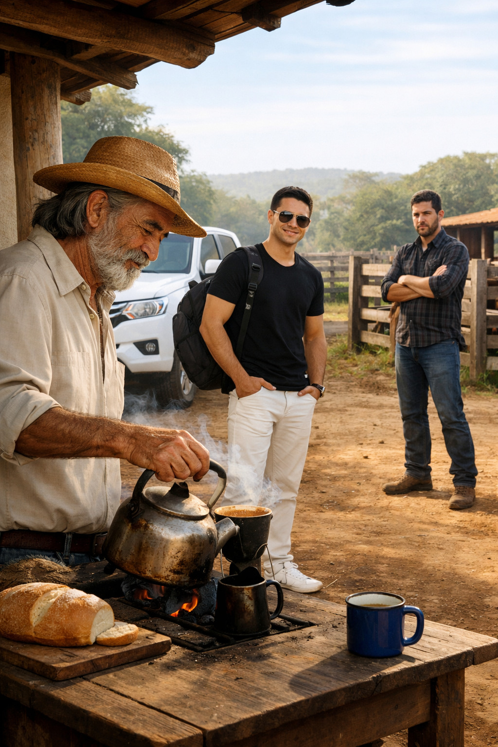 No interior, as histórias não começam em palácio. Começam na porteira, no terreiro batido de sol, no barulho do vento passando pela cerca de arame. A fazenda era grande, antiga, daquelas que passam de pai para filho. O Pai acordava cedo, fazia o café no fogão de lenha, olhava o curral antes do sol esquentar e conferia se a porteira tinha ficado bem fechada na noite anterior. A vida era simples, dura, mas tinha chão firme. Tinha mesa no fim do dia. Tinha silêncio bom quando a noite chegava.
