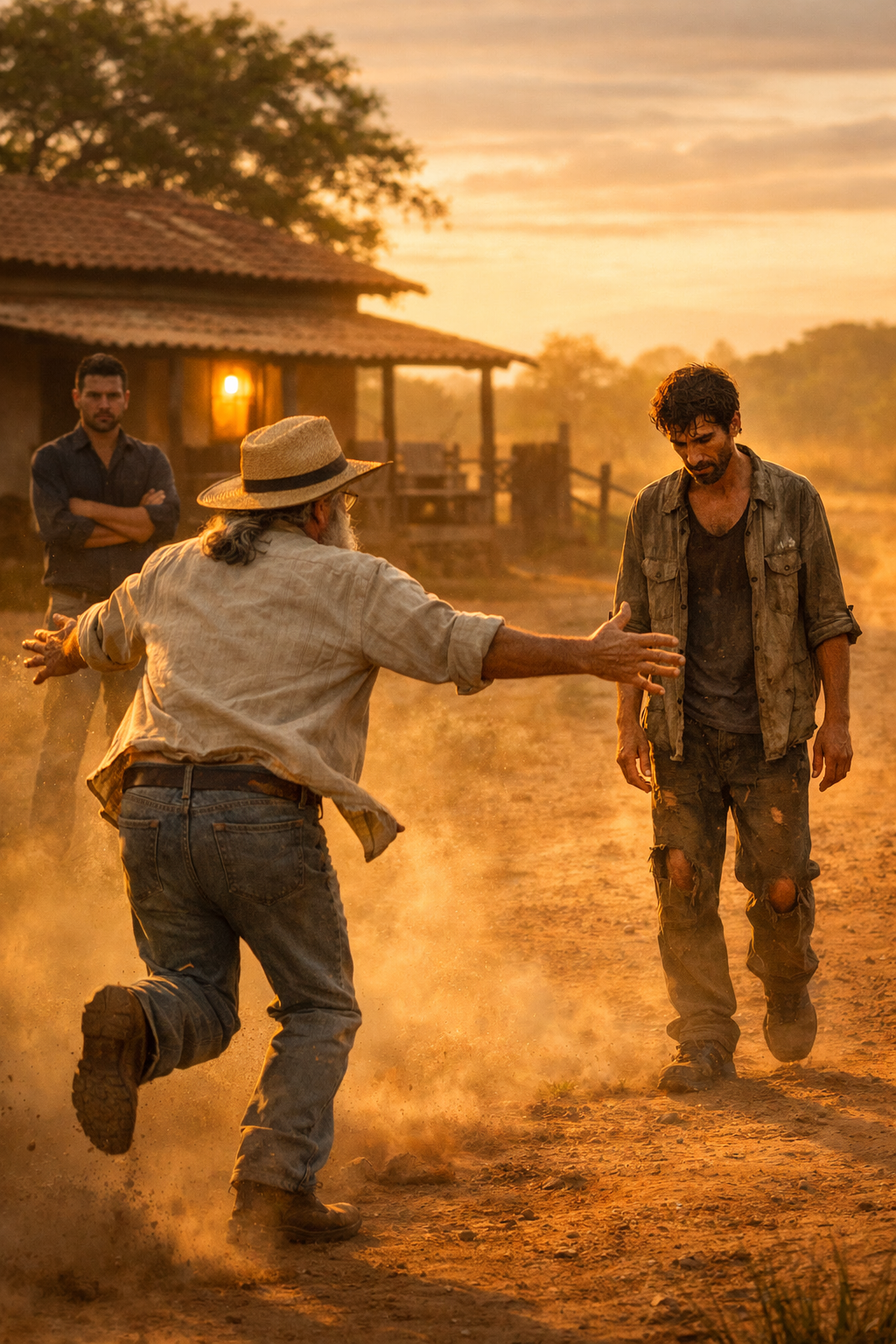 Na fazenda, o Pai seguia a rotina. Olhava o curral, ajeitava cerca, sentava na varanda no fim da tarde. O olhar sempre passava pela estrada. Num dia quente, o Pai viu uma silhueta torta vindo de longe. Não parecia ninguém conhecido. Parecia mais um andarilho perdido. Mas o jeito de andar trouxe memória. O coração reconheceu antes do olho. O Pai largou o que estava fazendo e correu pelo terreiro. Correu sem se importar com a idade, com a poeira, com o que os peões iam pensar.