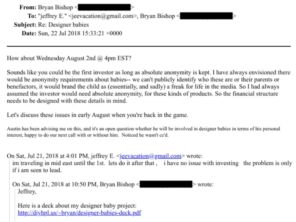 Bryan mencionou ainda que Epstein possivelmente seria o “primeiro investidor, desde que o anonimato absoluto seja mantido”. Mas ele sugeriu algumas condições, como evitar a identificação pública dos pais ou benfeitores, pois a mídia os rotularia como “aberrações para o resto da vida”.