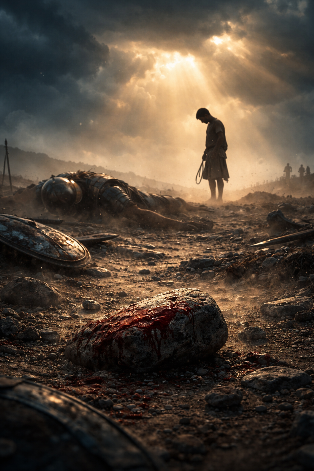 A Bíblia não afirma literalmente que cada pedra era para “um gigante”. O que ela afirma é mais forte: existiam cinco gigantes no total (Golias + quatro remanescentes), e todos caíram pelas mãos de Davi e de seus valentes (2Sm 21; 1Cr 20). Logo, a escolha de cinco pedras não é ingenuidade; é consciência de campo de batalha. Davi não entra em guerra com uma única munição — ele entra preparado para um teatro de operações.