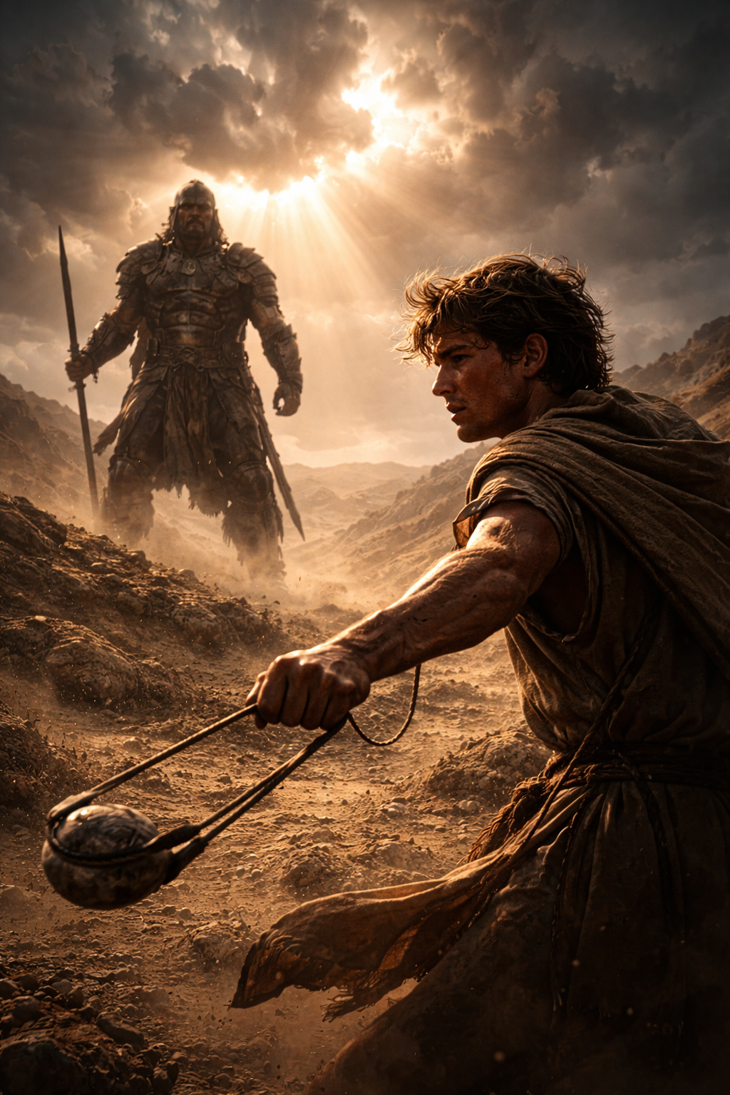 Golias não é apenas um filisteu alto com armadura pesada. Ele é o eco tardio de uma rebelião antiga contra a ordem da criação. A pedra de Davi não derruba apenas um guerreiro — ela atinge, simbolicamente e historicamente, a continuidade de uma corrupção que começou antes do Dilúvio.