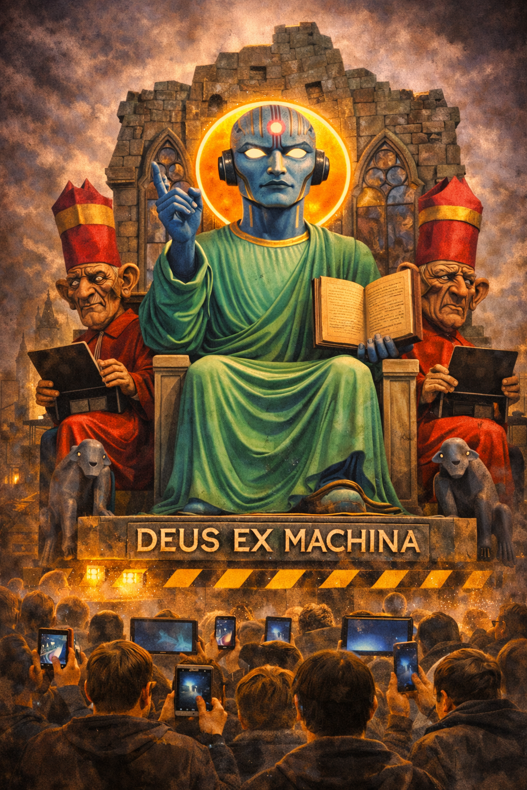 É nesse contexto que surge o tema “Deus Ex Machina – Eis o século XXI”. O título não é neutro. Não é poético. É uma acusação direta. Durante séculos, “deus ex machina” foi um recurso teatral: um falso deus que descia por uma máquina para resolver o enredo. No século XXI, a ironia se inverteu: a máquina deixou de ser o instrumento do deus e passou a ocupar o lugar do deus. A tecnologia não é mais apenas ferramenta; tornou-se instância de autoridade. A inteligência artificial começa a ser tratada como oráculo, conselheira, juíza, organizadora da realidade.