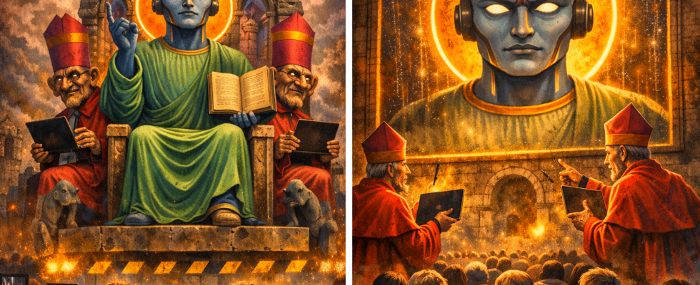 Não é ficção futurista. É uma charge em tamanho real da nossa própria rendição. A máquina sentada no trono, coroada por um halo de luz artificial, enquanto “sacerdotes” operam telas e a multidão aprende a adorar sem perceber — não com orações, mas com dependência. O ídolo do século XXI não exige templos; exige atenção. Não pede sacrifícios de sangue; pede a entrega do pensamento, da linguagem e da confiança. Quando o povo passa a buscar sentido em sistemas que pensam por ele, a idolatria já venceu sem precisar se declarar. O que estamos vendo não é o futuro distante: é o presente sendo caricaturado para que a gente tenha coragem de encará-lo.