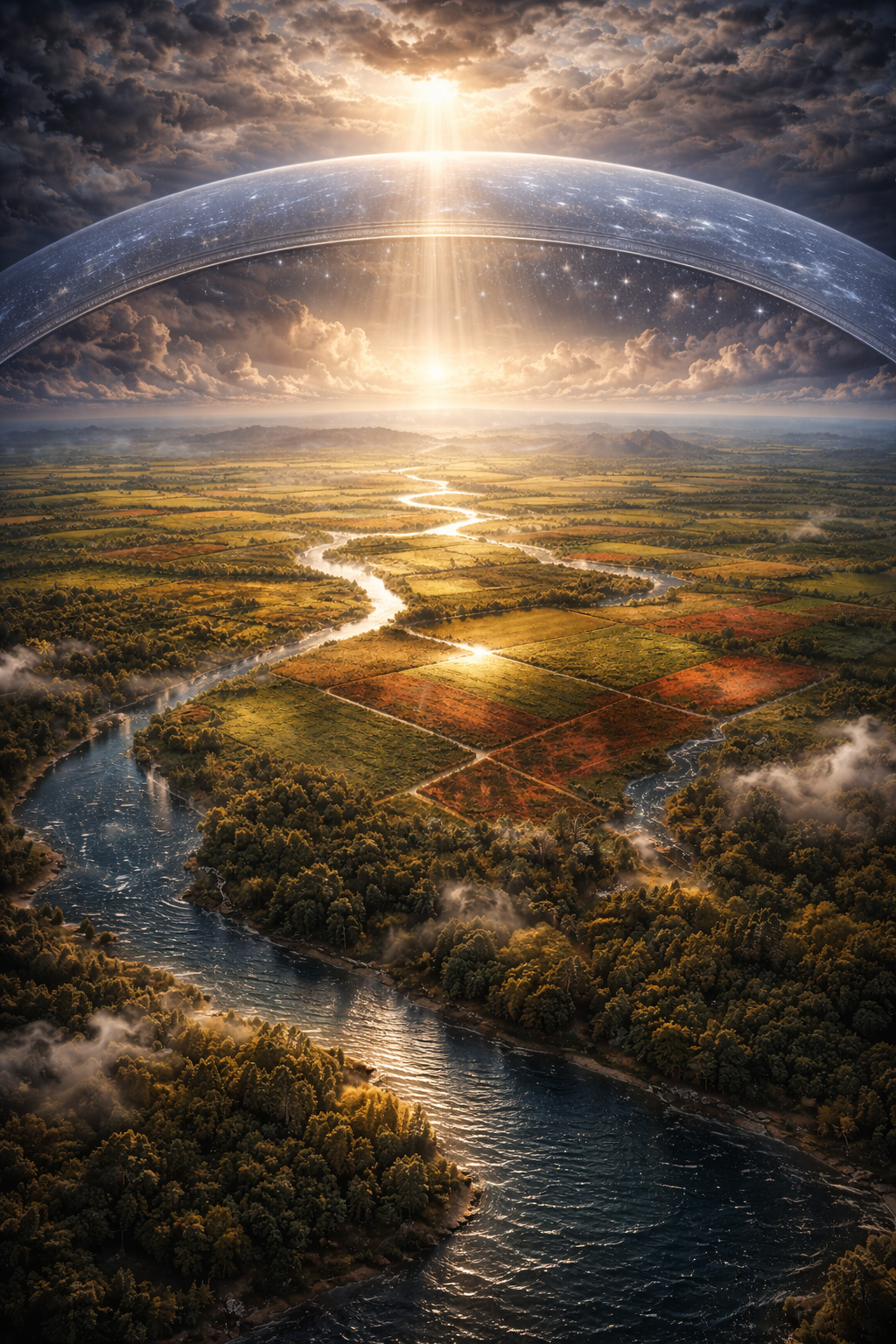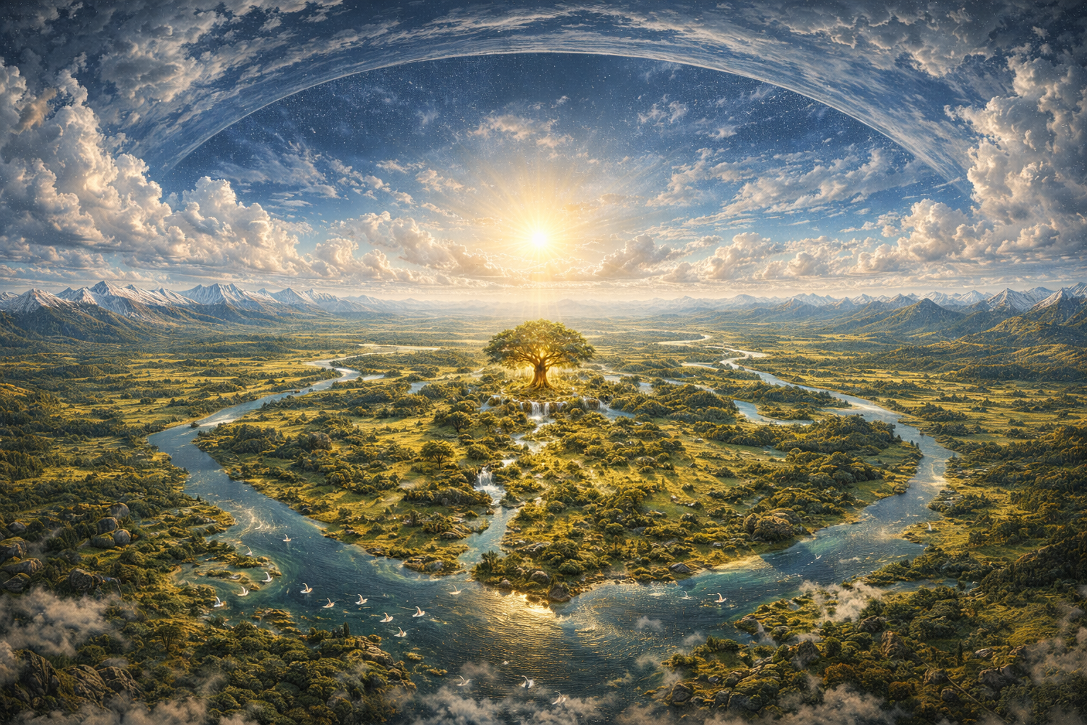 No centro dessa estrutura aparece a terra habitável — uma vasta superfície cultivável criada para sustentar a história da humanidade. Dentro dessa terra plana primordial, estendendo-se como uma grande planície irrigada por rios, estava Éden.