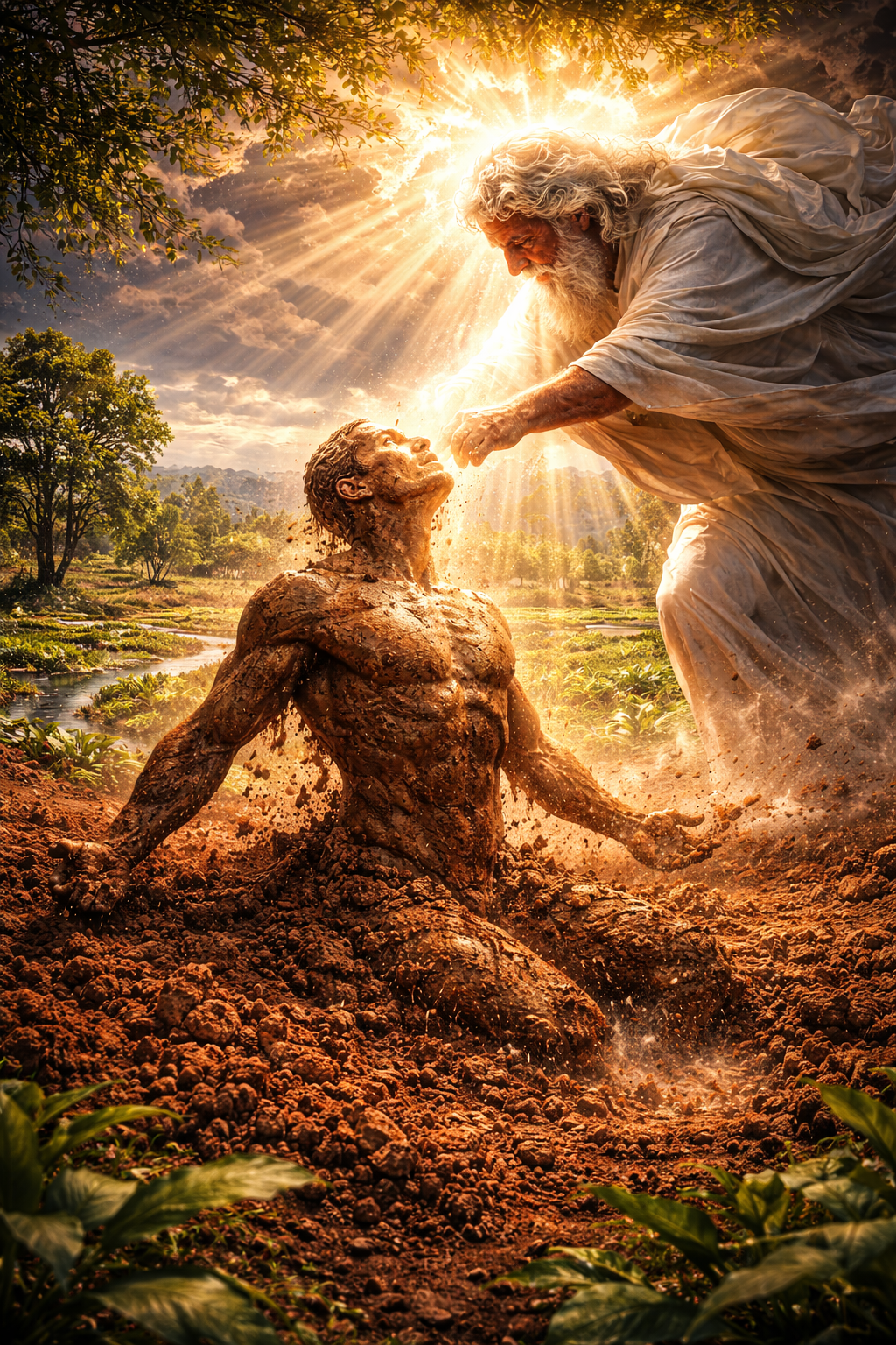 Dentro dessa planície primordial irrigada por rios surge o primeiro ser humano. Seu nome é Adão. O significado desse nome revela uma conexão profunda entre o homem e a terra. Adão deriva da palavra hebraica adamah, que significa solo fértil, terra cultivável, o chão vermelho das planícies agrícolas. O primeiro homem é literalmente o homem da terra. Ele é formado do pó da adamah e recebe o fôlego de vida diretamente de Deus.