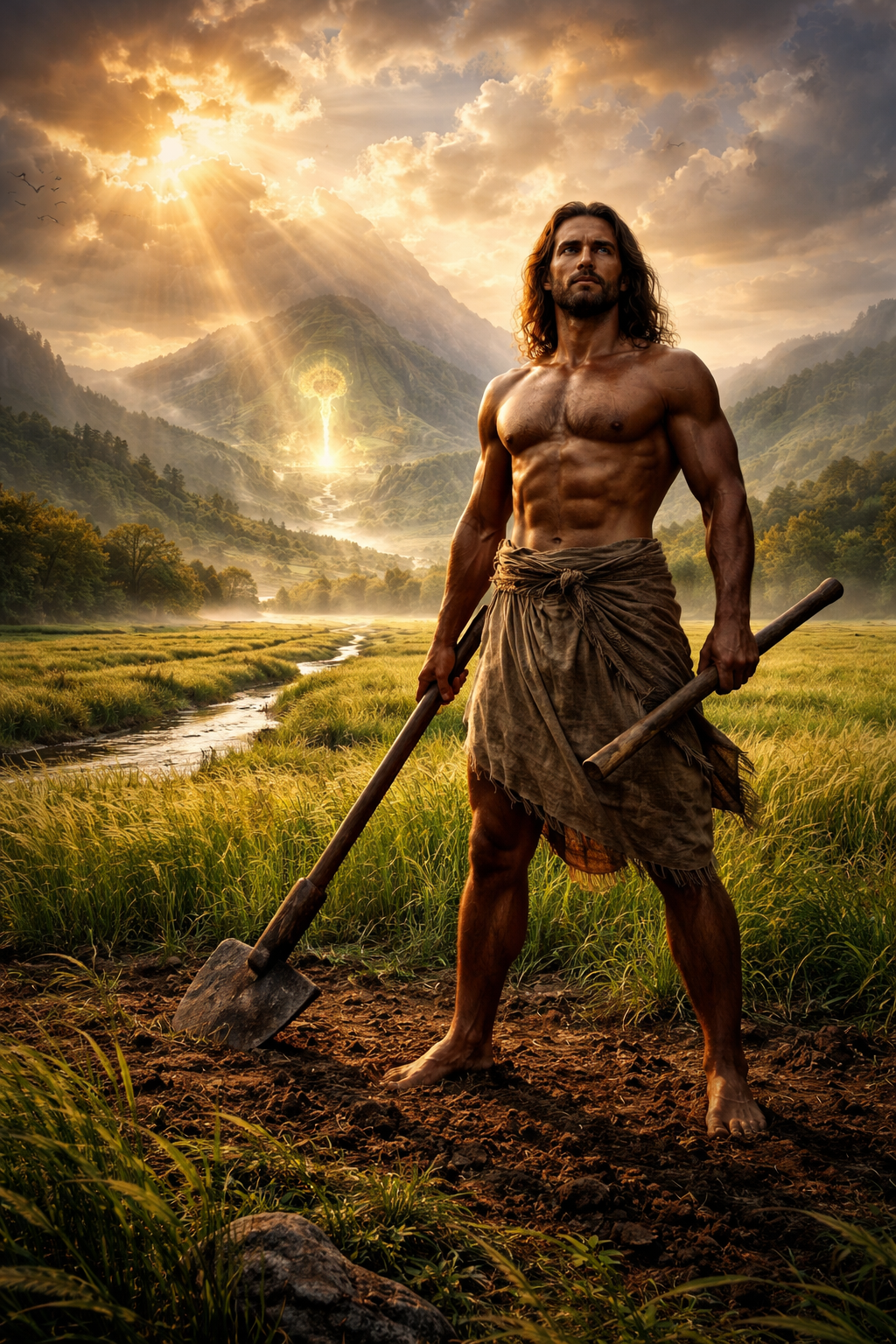 O primeiro homem não surge como visitante do mundo, mas como parte dele. Seu nome revela sua origem. Adão vem de adamah — o solo fértil, o chão vermelho da planície cultivável. O homem da terra foi literalmente formado da terra do Éden. Ele era o filho da planície primordial, moldado do pó da terra plana do jardim e colocado ali para cultivar o solo do qual havia sido formado.