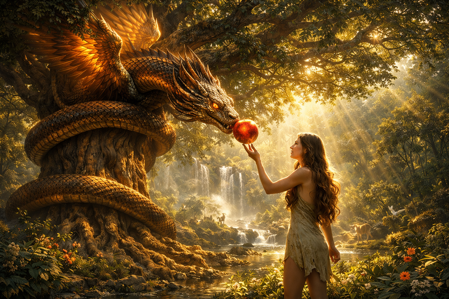 A estratégia da serpente não envolve força física. Ela opera através da persuasão. Primeiro questiona o mandamento. Depois sugere que Deus está escondendo algo do homem. Por fim apresenta a promessa central da tentação: se o fruto proibido for comido, os olhos do homem se abrirão e ele se tornará semelhante a Deus.