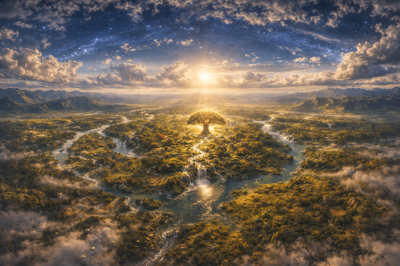 Essa rede fluvial transforma o Éden em um verdadeiro coração da criação. A água que nasce ali alimenta regiões distantes da terra. O jardim, plantado no centro desse território, recebe irrigação direta desse rio primordial, enquanto as planícies ao redor são nutridas por seus braços que se estendem pela superfície do mundo. Dentro dessa paisagem fértil surge a humanidade.