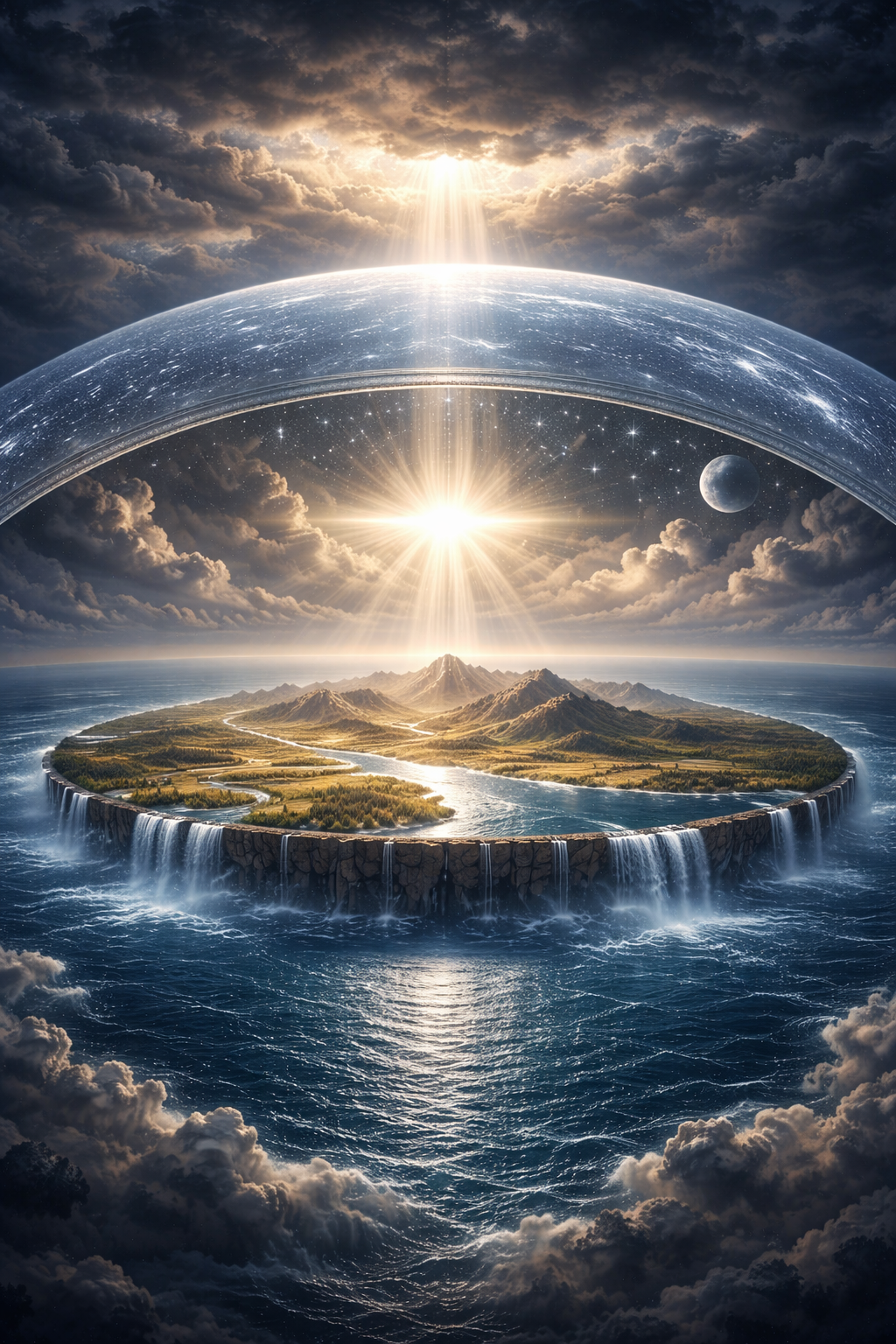 No centro dessa estrutura aparece a terra habitável — uma vasta superfície cultivável criada para sustentar a história da humanidade. Dentro dessa terra plana primordial, estendendo-se como uma grande planície irrigada por rios, estava Éden.