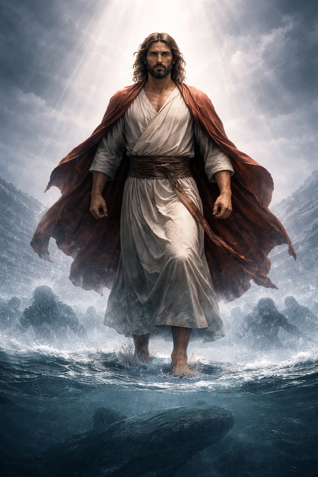Essa percepção encontra sua expressão máxima não em Noé, mas em Cristo. Jesus é a verdadeira Arca. Assim como a arca sustentou a vida sobre as águas do juízo, Cristo é quem sustenta a vida eterna sobre o juízo final. A imagem de Jesus sobre as águas, com as profundezas abaixo marcadas por destruição e caos, comunica exatamente isso: Ele está acima do juízo, domina o abismo e oferece salvação àqueles que se achegam a Ele.