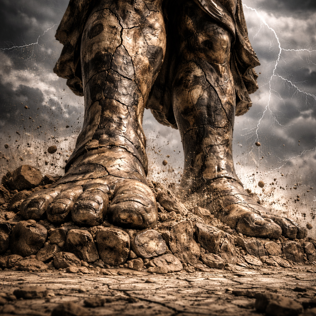 No entanto, essa leitura, embora correta em sua base histórica, ignora o ponto mais enigmático e, possivelmente, mais revelador de toda a visão: os pés da estátua. É justamente ali, no estágio final, que o texto abandona a linearidade política e introduz uma linguagem que não se encaixa em categorias diplomáticas, geopolíticas ou administrativas.