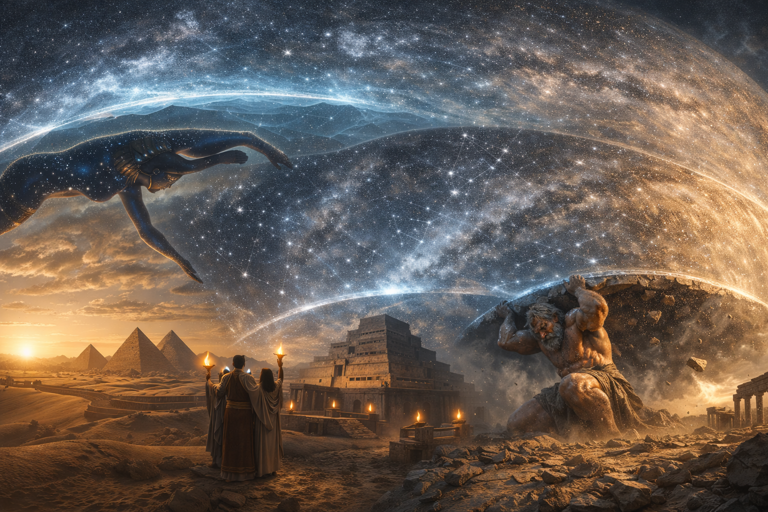 Na Grécia antiga, Atlas não carregava um planeta, mas sustentava o céu — uma estrutura que separava mundos. No Egito, a deusa Nut formava literalmente uma abóbada sobre a Terra com seu corpo arqueado. Na Mesopotâmia, o céu era descrito como uma barreira que continha as águas superiores.
