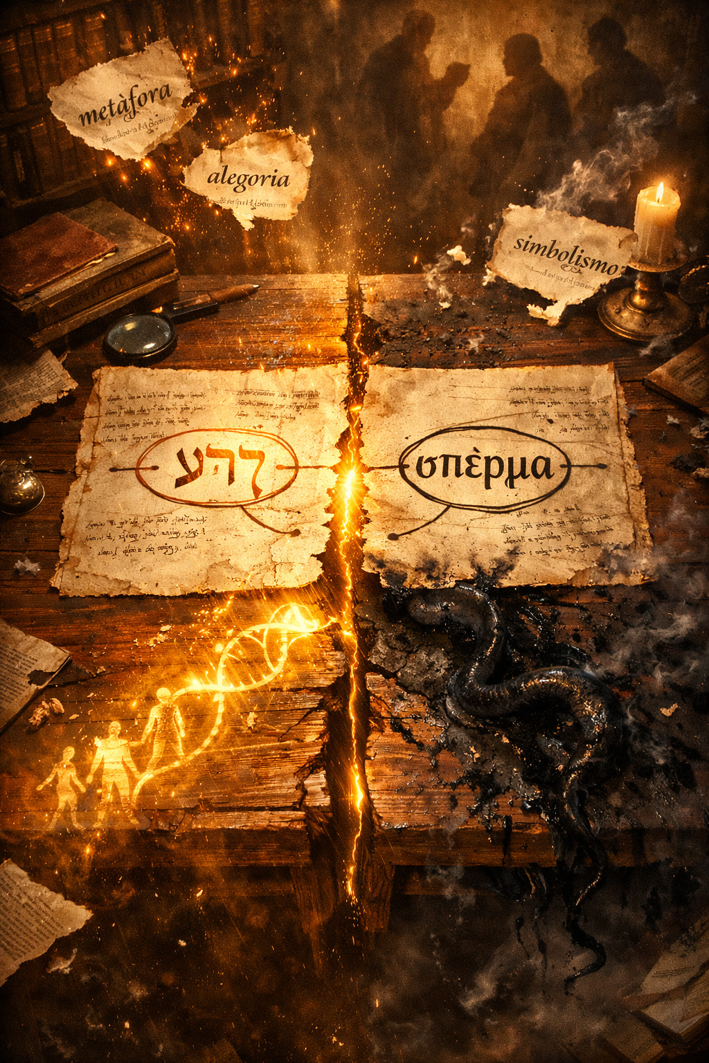 Durante séculos, o texto foi apresentado como uma simples alegoria moral — uma metáfora entre o bem e o mal, entre forças abstratas, entre comportamentos opostos. No entanto, quando nos afastamos das camadas interpretativas acumuladas e retornamos ao hebraico original e à sua tradução mais antiga em grego, descobrimos algo muito diferente. Descobrimos um texto que fala de origem, de geração, de continuidade. Um texto que utiliza uma palavra concreta, física, direta: זֶרַע (zera‘) — traduzida como σπέρμα (sperma). Um termo que, em sua base, significa semente no sentido mais literal possível: sêmen.