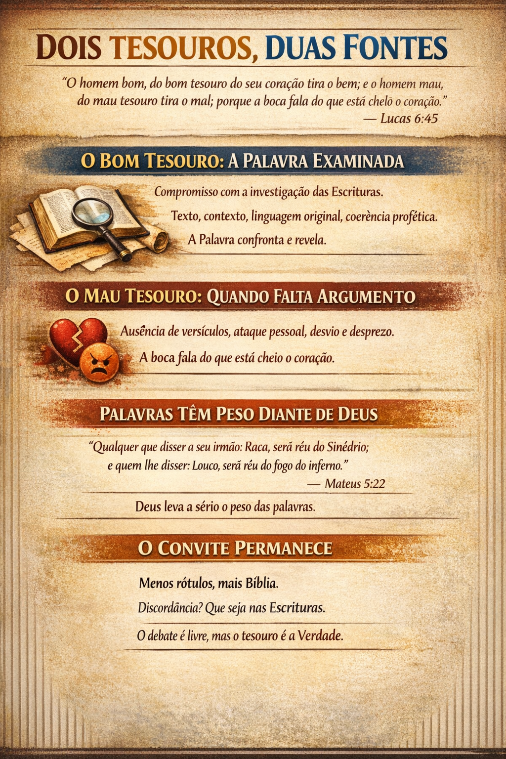 Porque, como disse o próprio Cristo, a boca não fala por acaso — ela expõe o conteúdo do coração. Quando não há argumento, o que emerge é o que está guardado: desprezo, desvio, fuga do confronto com o texto.