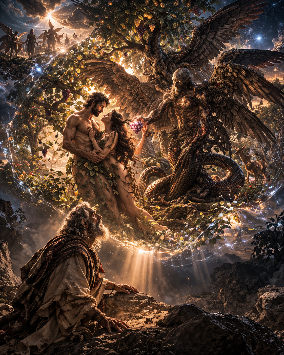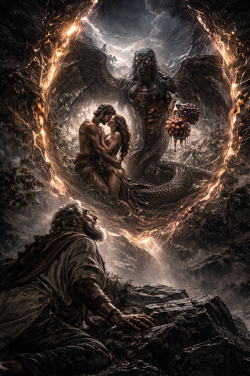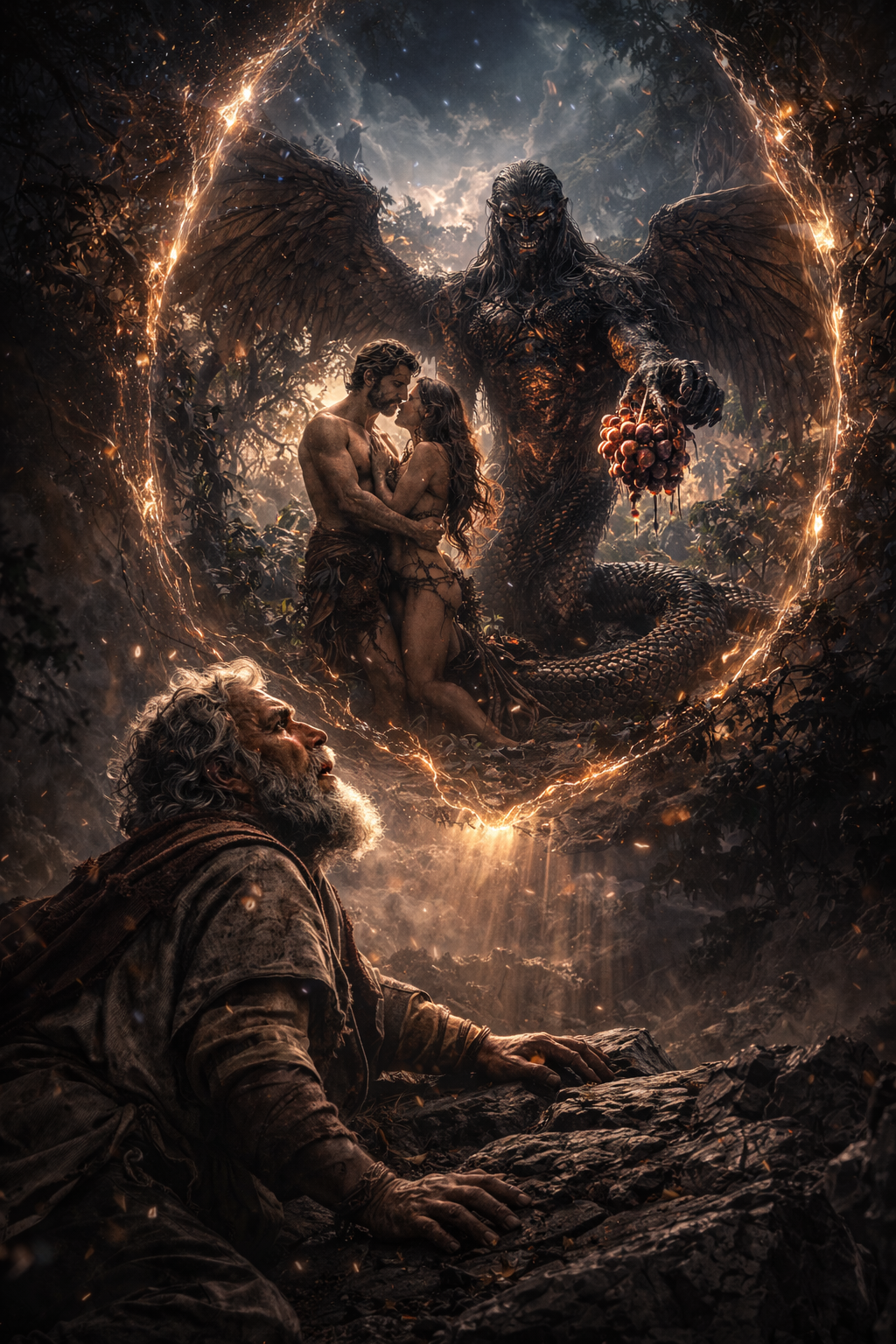 O próprio fluxo do texto sugere que a visão da humanidade em sua diversidade não é completa sem a revelação do que aconteceu no início. E é exatamente nesse ponto que surge a cena: Adão e Eva entrelaçados, a figura intermediária identificada como Azazel, a serpente com características híbridas, e o ato de entrega do fruto dentro desse contexto.