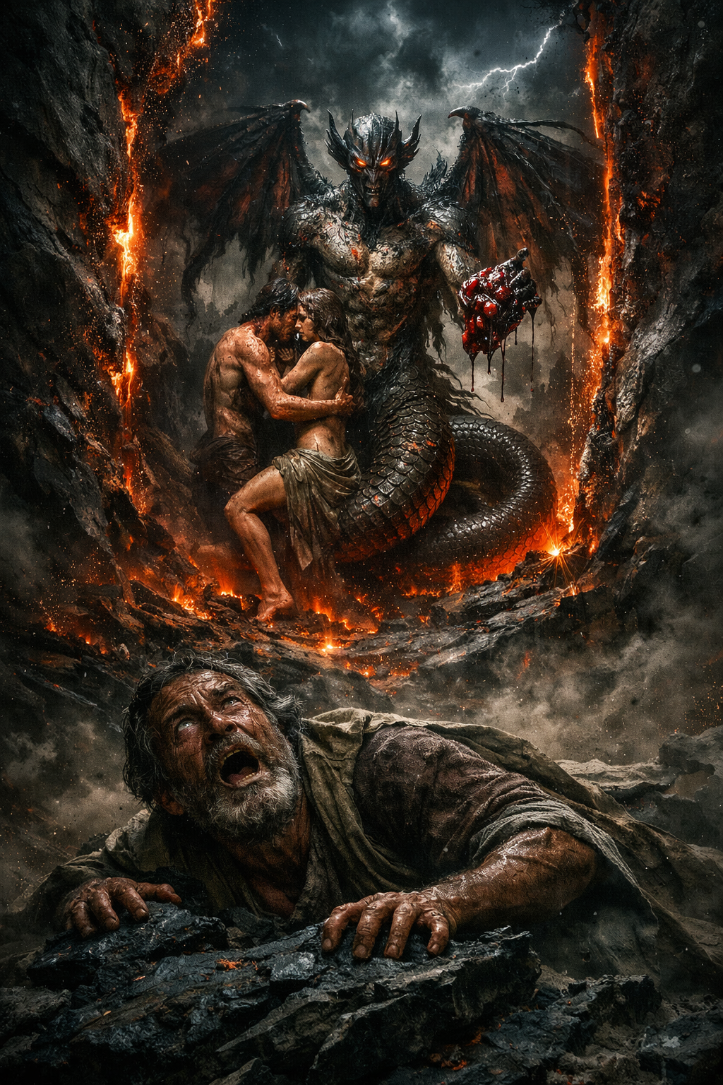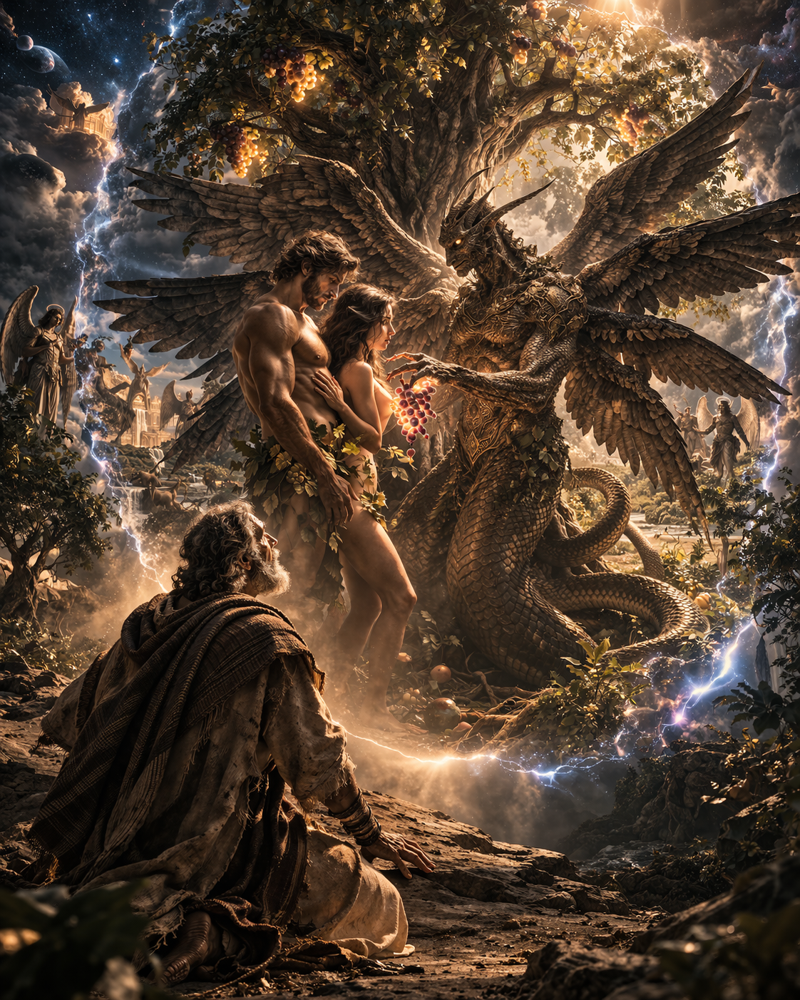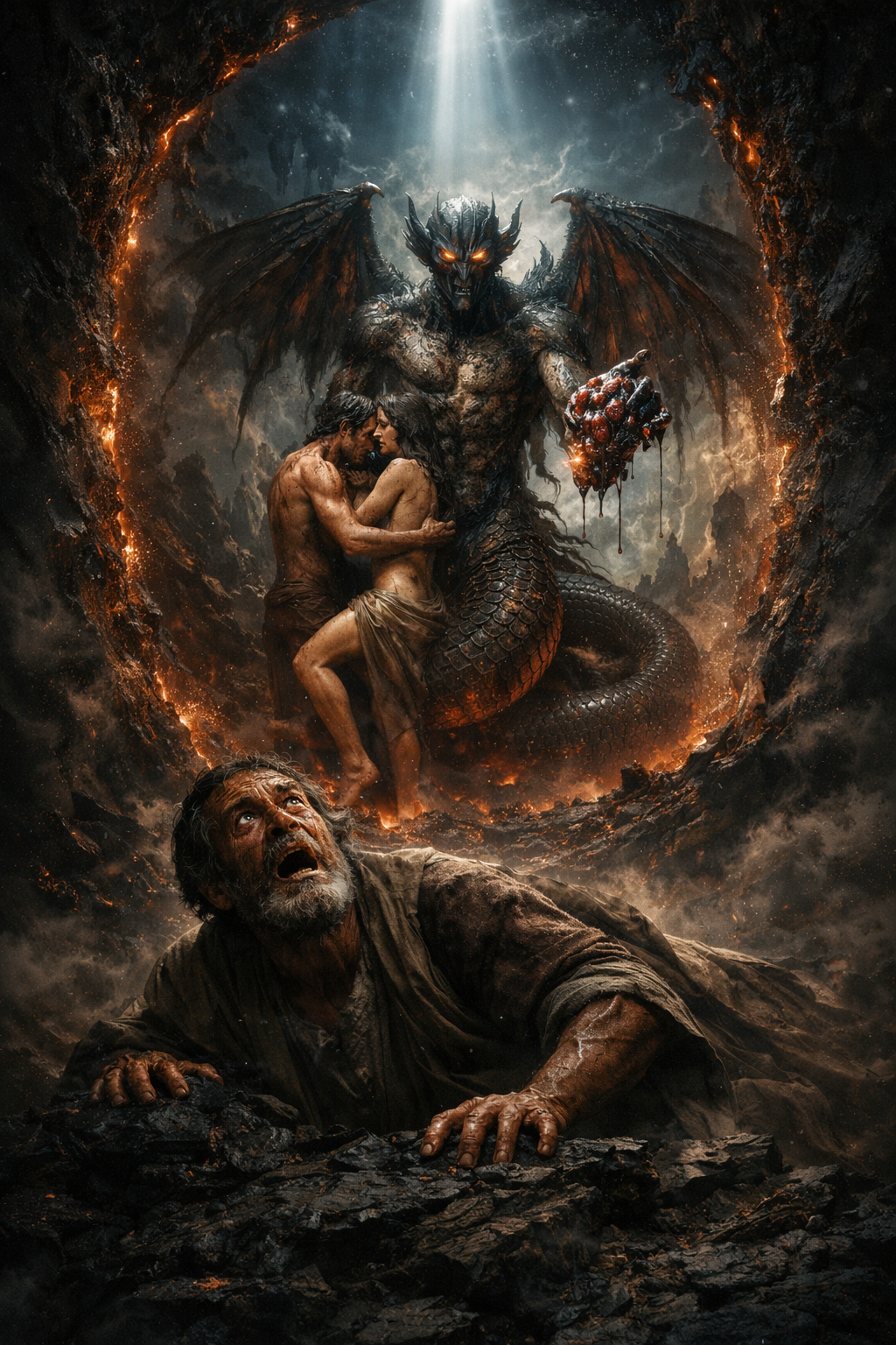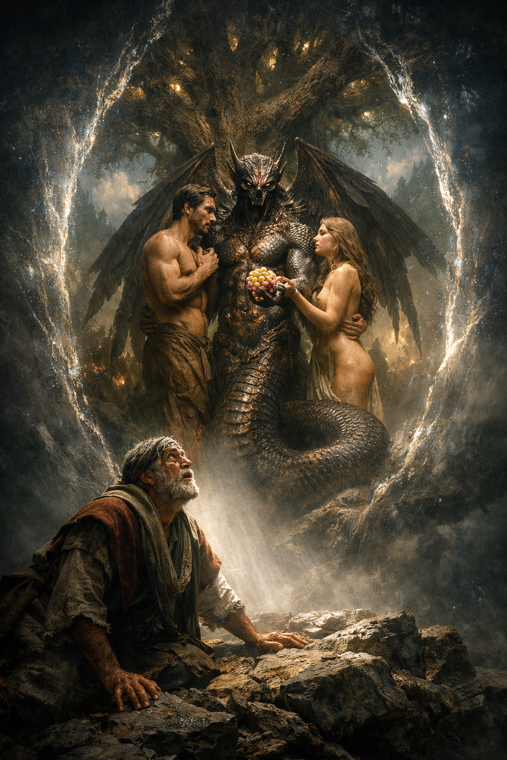 O próprio fluxo do texto sugere que a visão da humanidade em sua diversidade não é completa sem a revelação do que aconteceu no início. E é exatamente nesse ponto que surge a cena: Adão e Eva entrelaçados, a figura intermediária identificada como Azazel, a serpente com características híbridas, e o ato de entrega do fruto dentro desse contexto.