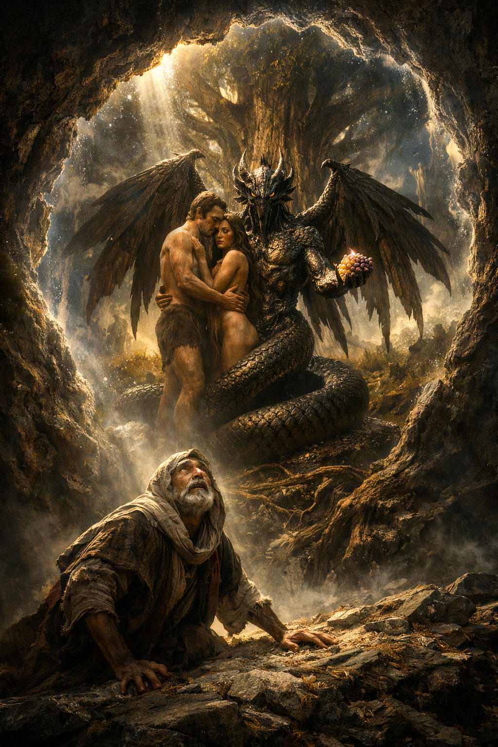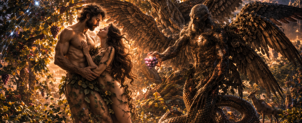 Quando a cena do Éden aparece, ela já não é neutra. Adão e Eva não estão simplesmente diante de uma árvore; eles aparecem entrelaçados, e entre eles está uma figura identificada como Azazel, associada à serpente. O fruto não surge isolado, mas mediado. Isso altera completamente a leitura do evento. O que, em Gênesis, pode ser lido como uma sequência simples — diálogo, decisão, ação — aqui se transforma em uma cena carregada, onde a presença de um agente intermediário levanta a possibilidade de que a queda envolva mais do que escolha individual.