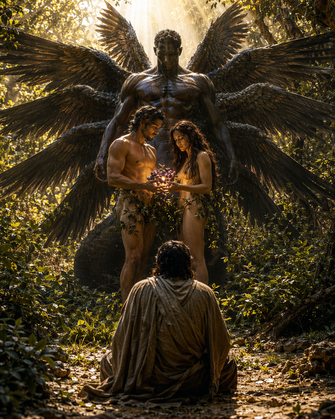 Dentro dessa visão, a cena do Éden ganha uma densidade absolutamente diferente daquela apresentada de forma condensada em Gênesis. O que ali aparece como a “serpente” é aqui revelado com detalhes perturbadores: uma entidade com forma híbrida, dotada de mãos, pés e múltiplos pares de asas, posicionada deliberadamente entre Adão e Eva, participando ativamente do momento da transgressão.