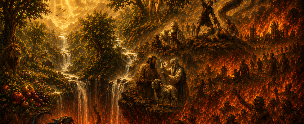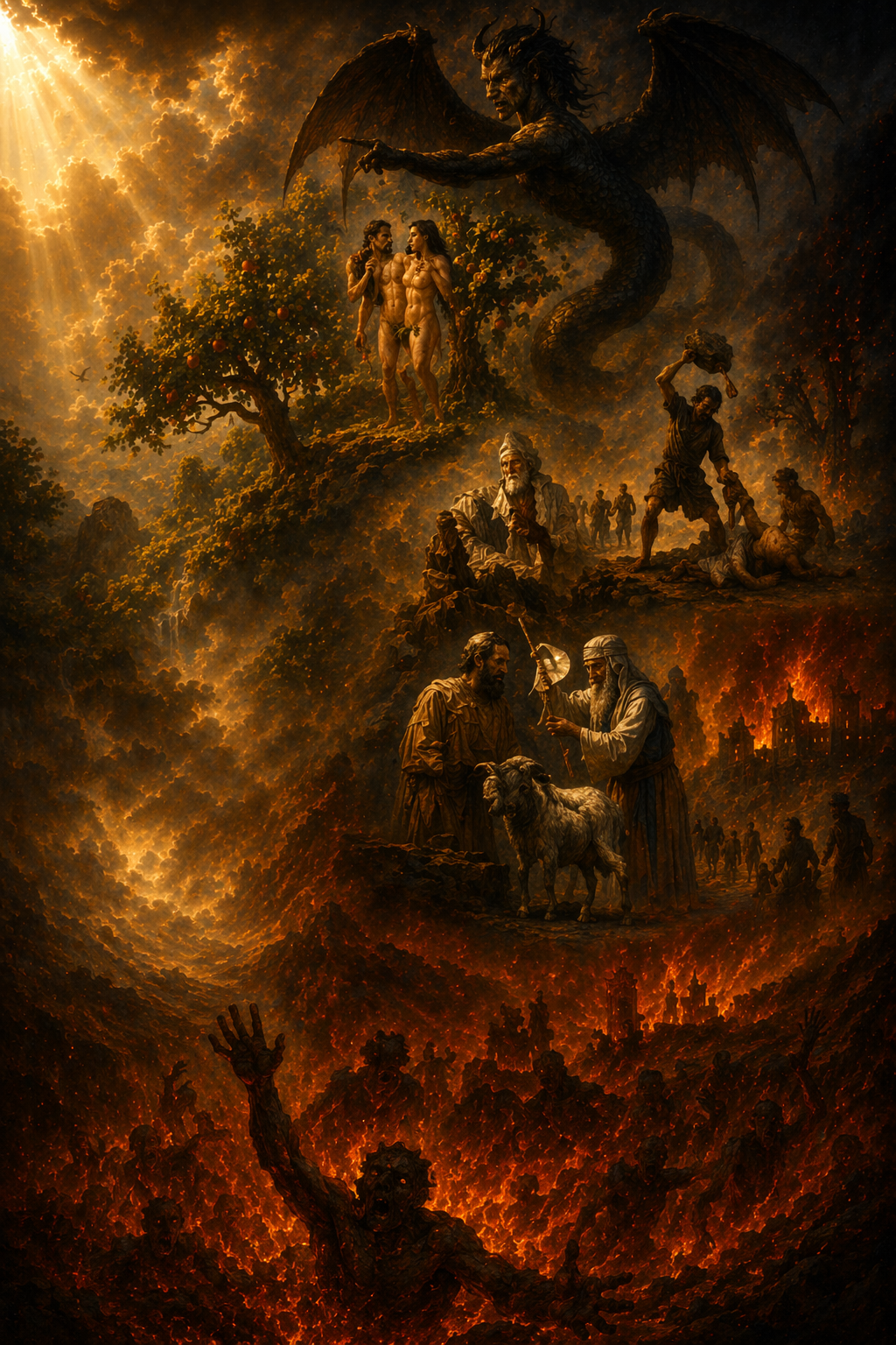 Assim, o ciclo se completa sem lacunas: a infiltração no Éden, a propagação do pecado na história, a contenção parcial através do sistema sacrificial e a condenação definitiva no fim dos tempos não são narrativas desconexas, mas partes de um único enredo contínuo.
