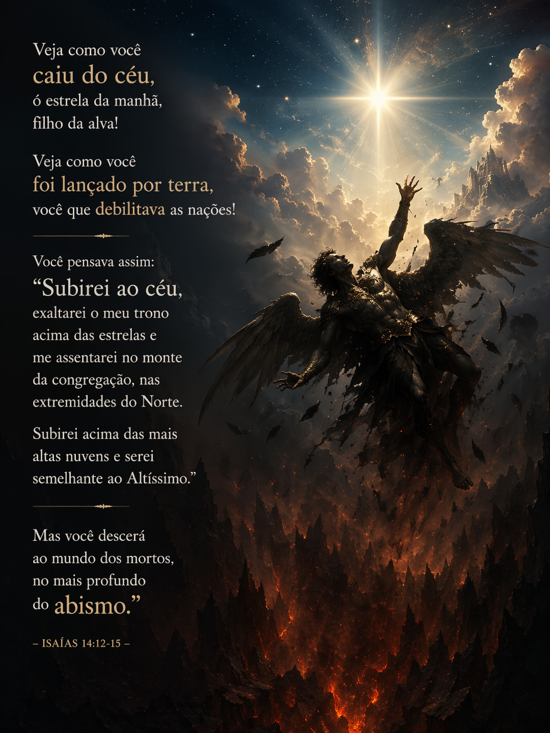 “Como caíste desde o céu, ó Lúcifer, filho da alva! Como foste cortado por terra, tu que debilitavas as nações! E tu dizias no teu coração: Eu subirei ao céu, acima das estrelas de Deus exaltarei o meu trono, e no monte da congregação me assentarei, aos lados do norte. Subirei sobre as alturas das nuvens, e serei semelhante ao Altíssimo. E contudo levado serás ao inferno, ao mais profundo do abismo.” — Isaías 14:12-15 — Versão Almeida Corrigida e Fiel