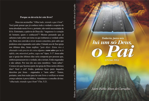 Novo livro: "Todavia, para nós há um só Deus, o Pai" Prezado irmão, Recém foi terminado o livro "Todavia, para nós, há um só Deus, o Pai", cuja capa e arquivo em formato *.doc estão em anexo. Baseado em um primeiro material compilado ao fim de 2006 mas não publicado, ele é o resultado de alguns anos de oração e estudo, pesquisa e comparação de diferentes versões da Bíblia a fim de responder duas perguntas: "Quantos deuses existem?" e "Quem é Deus?". Clique aqui para baixar o livro. O conteúdo deste livro objetiva capacitar melhor o leitor a compreender a revelação do amor de Deus por meio da pessoa do Filho de Deus - Jesus Cristo, e do sacrifício da cruz, e habilitá-lo a viver e pregar a verdadeira mensagem dada pelo primeiro anjo de Apocalipse 14: "...adorai Aquele que fez o céu, a terra, o mar e as fontes das águas". O material foi revisado por alguns irmãos que deram também suas contribuições para que o texto chegasse a esta versão final: Rogério Buzzi, Evandro Putziger, Gilmar Cerqueira e outros que apoiaram com orações e incentivo. Que Deus recompense a cada um naquilo que contribuiu para que este material fosse colocado ao alcance das almas sinceras. Oramos para que Deus atue fortemente na vida de todos os que o lerem. Se tiverem o benefício que recebi ao escrevê-lo, creio que a leitura já terá valido a pena. Os irmãos interessados em adquirir o livro para uso pessoal ou para evangelismo poderão fazê-lo contactando-nos pelo telefone 41 9229-9321, ou e-mail: jairo_carvalho3@hotmail.com. Que Deus abençoe a todos os visitantes deste site, Jairo Carvalho.