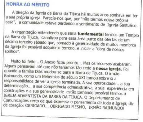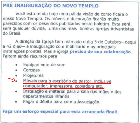Diário do Sábado na Igreja da Barra da Tijuca Rio de Janeiro, 24 de agosto de 2002. Sábado é um dia especial. Como dizia aquele hino da escolinha, "o sábado é um dia feliz"! Hoje, sábado 24/08, está sendo muito especial para a IASD Barra da Tijuca (RJ) pois pré-inauguramos o novo templo, que está em construção. Convinha que um novo templo nascesse neste bairro, pois se a pregação do evangelho consiste em dar as boas novas de salvação, então, deve ser pregada a todo mundo, logo, tínhamos de crescer... Graças a Deus! “A igreja, na verdade, tinha paz por toda a Judéia, Galiléia e Samaria, edificando-se e caminhando no temor do Senhor, e, no conforto do Espírito Santo, crescia em número. (Atos 9:31)” Todos, muito prestativos, queríamos participar na programação de inauguração. Até nosso pastor, o qual abertamente confessa não gostar de “passar a lição da escola sabatina” (e, portanto, se auto-escala apenas a uma lição por trimestre), também participou com a revisão da mesma nesta manhã! Enfim, muitas informações e uma bela programação para Sábado vinham descritas no boletim, que sempre recebemos na porta da igreja. Uma das informações era esta: Então pensei: "Escritório, computador, impressora, copiadora... Será que é para o pastor ou para algum gerente executivo? Acabei me lembrando de Mateus 8:20: “Mas Jesus lhe respondeu: as raposas têm seus covis, e as aves do céu, ninhos; mas o Filho do Homem não tem onde reclinar a cabeça.” Lembrei-me ainda do testemunho de Jesus acerca de João: “Sim, que saístes a ver? Um homem vestido de roupas finas? Ora, os que vestem roupas finas assistem nos palácios reais. Mas para que saístes? Para ver um profeta? Sim, eu vos digo, e muito mais que profeta.” (Mateus 11:8,9) Será que computador, impressora, copiadora, etc, são expressões modernas para “bolsa, alforje e espada”? “A seguir, Jesus lhes perguntou: Quando vos mandei sem bolsa, sem alforje e sem sandálias, faltou-vos, porventura, alguma coisa? Nada, disseram eles. Então, lhes disse: Agora, porém, quem tem bolsa, tome-a, como também o alforje; e o que não tem espada, venda a sua capa e compre uma. (Lucas 22:35,36)” Concluí que não, pois quando Jesus assim falou, levar consigo bolsa, alforje e espada, era uma expressão que indicava a atitude de quem iria empreender uma viagem perigosa, símbolo da prova que Jesus e seus discípulos passariam a enfrentar ... e hoje, num escritório?! Teria então, a implantação de tanta tecnologia, uma correlação entre “coisas novas e coisas velhas”? “Então, lhes disse: Por isso, todo escriba versado no reino dos céus é semelhante a um pai de família que tira do seu depósito coisas novas e coisas velhas. (Mateus 13:52).” Também concluí que não, pois se tratando de um ensinamento, Jesus estava se referindo a ensinar o novo (sobre “o reino de Deus e Sua justiça”) sem desconsiderar o valor do antigo (a lei de Moisés, “a Lei e os Profetas”) e hoje, não o é diferente. Policiando meu pensamento, comecei a dizer: Sábado, sábado... tu és do Senhor! Ao se iniciar o culto, compondo o quadro de oficiais da plataforma, estavam os líderes da igreja, o pastor e o “irmão-Neemias”, daí, lembrei-me: Já tivemos tantos irmãos que fizeram algo por esta igreja, o velho e bom irmão-Golden e muitos outros, assim como foi no passado: “Da multidão dos que creram era um o coração e a alma. Ninguém considerava exclusivamente sua nem uma das coisas que possuía; tudo, porém, lhes era comum. Com grande poder, os apóstolos davam testemunho da ressurreição do Senhor Jesus, e em todos eles havia abundante graça. Pois nenhum necessitado havia entre eles, porquanto os que possuíam terras ou casa, vendendo-as, traziam os valores correspondentes e depositavam aos pés dos apóstolos; então, se distribuía a qualquer um à medida que alguém tinha necessidade. (Atos 4: 32-35)” ...mas hoje, a bola da vez é o “irmão-Neemias”. Como assim? Aprendi que devemos agradecer primeiramente a Deus, que é o Senhor de todas as coisas, sendo os homens apenas mordomos e instrumentos Seus. Seria propícia esta mensagem de Jesus? “Guardai-vos de exercer a vossa justiça diante dos homens, com o fim de serdes vistos por eles; doutra sorte, não tereis galardão junto de vosso Pai celeste. Quando, pois, deres esmola, não toques trombeta diante de ti, como fazem os hipócritas, nas sinagogas e nas ruas, para serem glorificados pelos homens. Em verdade vos digo que eles já receberam a recompensa. Tu , porém ao dares a esmola, ignore a tua mão esquerda o que faz a tua mão direita, para que a tua esmola fique em secreto; e teu Pai, que vê em secreto, te recompensará.” (Mateus 6:1-4) Já estava ficando preocupado pois, infelizmente, tudo parecia estar se encaixando, quando o pregador (visitante), felizmente, falou sobre “os dois fundamentos”. Disse que devemos ouvir e observar as palavras do Senhor, tornando-nos uma “casa firme”, com alicerces que não se estremecem com as filosofias e éticas profanas, mesmo que estas busquem se infiltrar pelas brechas. “Mas vem a hora e já chegou, em que os verdadeiros adoradores adorarão o Pai em espírito e em verdade; porque são estes que o Pai procura para seus adoradores. Deus é espírito; e importa que os seus adoradores o adorem em espírito e em verdade.” (João 4:23,24) Informou o Plantão do Diário do Sábado, da Igreja da Barra da Tijuca, RJ. |