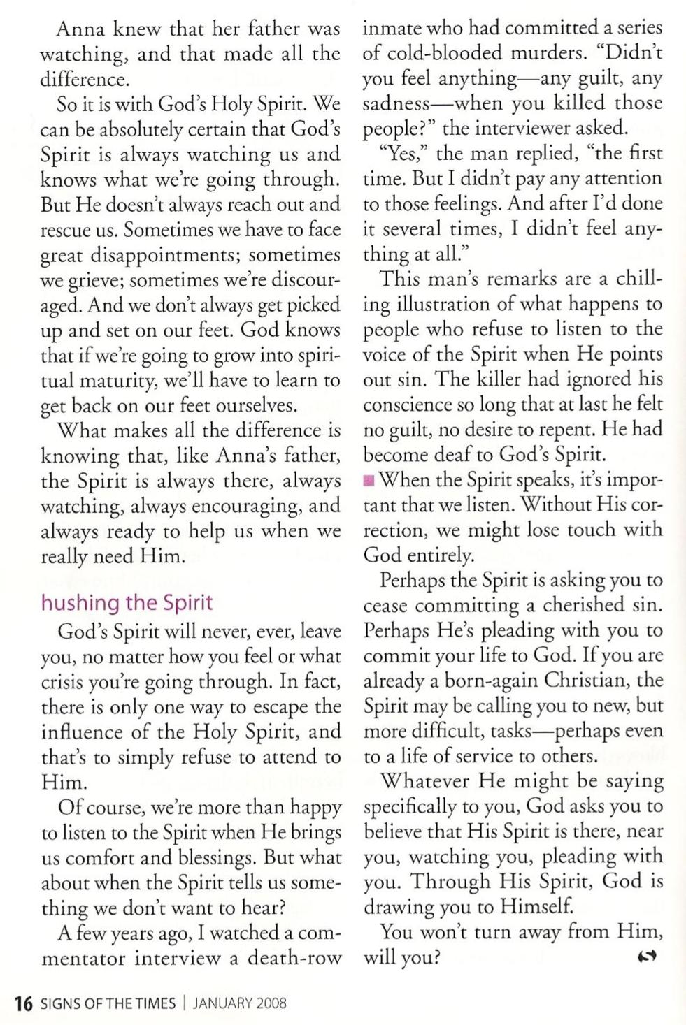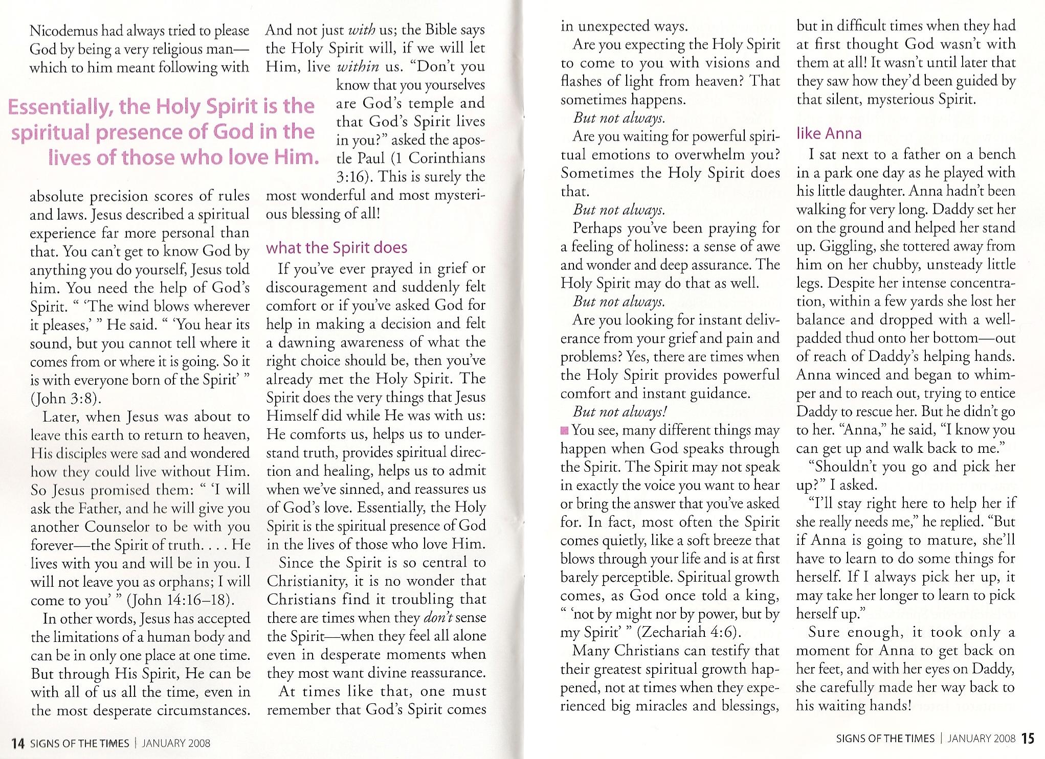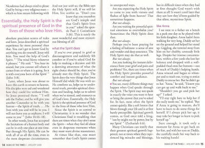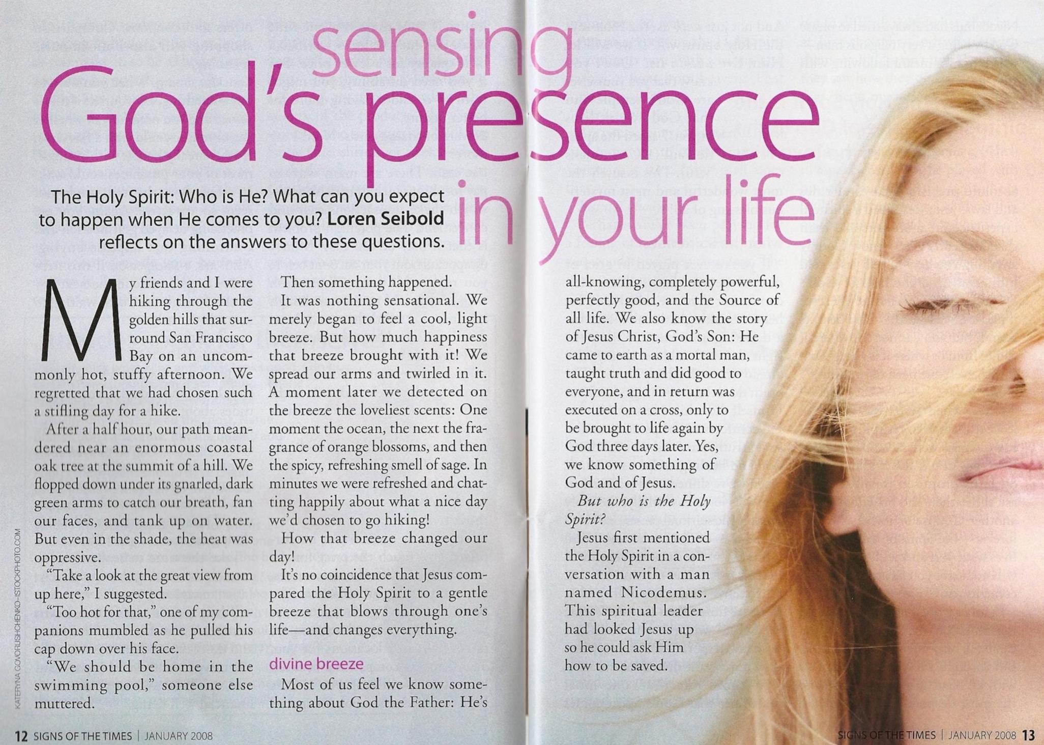 O que me chamou a atenção foi um artigo a respeito do Espírito Santo cujo título é “Sensing God’s Presence in Your Life” (“Sentindo a Presença de Deus em Sua Vida”). Logo após o título do artigo, a autora pergunta no subtítulo “O Espírito Santo: Quem é Ele?”