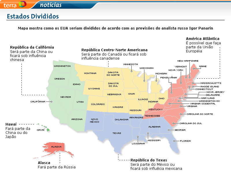 EUA entrarão em guerra civil em 2010, diz analista "Há entre 45% e 55% de chance de que a desintegração dos Estados Unidos aconteça", disse Panarin, em entrevista do Wall Street Journal. O especialista em relações EUA-Rússia acredita que, apesar de um quadro como esse não ser o melhor para Rússia em curto prazo, já que o país depende muito do dólar e do comércio com os americanos, a queda dos Estados Unidos colocará a Rússia novamente em destaque no cenário internacional. Para Panarin, no próximo outono, a imigração em massa, o declínio econômico e a degradação moral levarão os Estados Unidos a uma guerra civil, que causará o colapso do dólar. Aproximadamente no fim de junho ou no começo de julho de 2010, segundo ele, o país, que então será comandado por Barack Obama, acabará dividido em seis partes - inclusive com o Estado do Alasca sendo revertido ao controle russo. Depois de passarem uma década sendo desacreditadas, as idéias de Panarin vêm sendo discutidas por especialistas locais, além da cobertura estatal russa, segundo o WST. Recentemente ele apresentou sua teoria em uma discussão no Ministério das Relações Exteriores. Na TV, um jornalista disse que as teorias de Panarin "refletem o alto grau de antiamericanismo existente na Rússia hoje em dia". Estados Divididos A previsão de Panarin é baseada em dados da FAPSI, órgão russo equivalente à Agência Nacional de Segurança americana. Ele crê que problemas econômicos e demográficos provocarão uma crise social nos Estados Unidos. Quando isso acontecer, os Estados mais "saudáveis" vão reter fundos federais e automaticamente haverá uma secessão. Isso causará descontentamento social e inclusive uma guerra civil. Depois da divisão, os Estados dos EUA formarão repúblicas sob influência de outras nações. A Califórnia formará um núcleo que ele chama de "República da Califórnia". Ela fará parte da China ou ficará sob influência chinesa. O Texas será o coração da "República do Texas", um núcleo de Estados que fará parte do México. Já Washington e Nova York farão parte da "República Atlântica", que deve fazer parte da União Européia. Ainda há a "República Centro-Norte Americana", da qual farão parte os Estados do norte, que ficarão sob influência canadense, o Havaí, que será da China ou do Japão, e o Alasca, que será controlado pela Rússia. "É razoável que a Rússia fique com o Alasca, já que ele fez parte do Império Russo por um longo período", defende Panarin. Sobre a esperança depositada em Barack Obama, o especialista é bem claro. "Os americanos acreditam que o presidente eleito Barack Obama pode 'operar milagres', mas quando a primavera chegar ficará claro que não há milagres", escreveu Panarin em um artigo publicado recentemente no jornal Izvestia, um dos maiores diários da Rússia. No texto, ele também defende que a China e a Rússia vão assumir o papel de regulador financeiro mundial, papel hoje desempenhado por Washington. Igor Panarin é doutor em Ciência Política e professora da Academia Diplomática do Ministério das Relações Exteriores da Rússia. É autor de nove livros, entre eles Infowar and power (Guerra de Informação e Poder), Infowar and world (Guerra de Informação e o Mundo) e Infowar and election (Guerra de Informação e Eleições). Além disso já publicou artigos em várias revistas especializadas em política e vem participando de debates sobre a relação entre Rússia e EUA em emissoras de TV. |