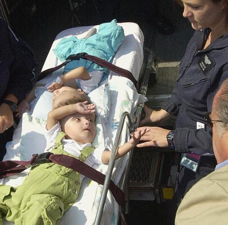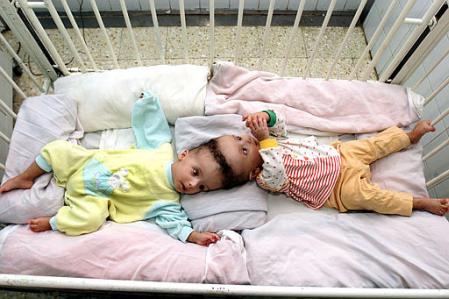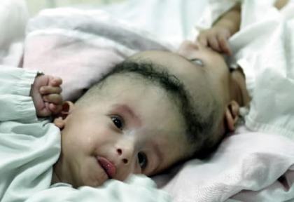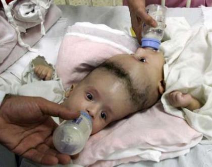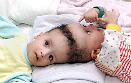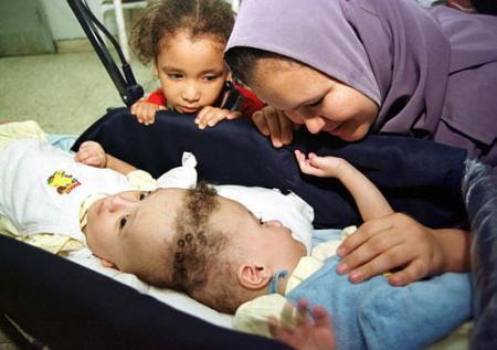 Garotos egípcios também nasceram grudados pela cabeçaAhmed e Mohamed Ibrahim nasceram em 2 de junho de 2001, pouco mais de um mês antes das gêmeas guatemaltecas separadas no início desta semana em Los Angeles, EUA. O problema deles é tido como mais grave porque exames médicos já indicaram que parte dos cérebros de ambos pode estar sendo compartilhada. Além disso, houve o aspecto religioso, uma vez que seus pais, que trabalham como agricultores no Egito, são muçulmanos e temiam desrespeitar a vontade de Deus. Segundo o Dr. Nasser Abdel Al, que acompanha o caso, há risco de que um deles, ou ambos, morra por causa da cirurgia. Por isso, os pais aguardavam uma autorização do clero islâmico. Uma enquete realizada pela televisão indicou que a maioria da população do Egito, que se manifestou através de 30 mil cartas e telefonemas, entende que a atual situação dos meninos é a vontade de Deus para eles e que, por isso, não deveriam ser separados. Os meninos estiveram nos Estados Unidos no início de julho para exames de avaliação do risco e das possibilidades cirúrgicas. O resultado foi relativamente animador, mas a cirurgia ainda não foi marcada. Autoridades religiosas apresentaram pontos de vista opostos, mas a decisão caberá unicamente aos pais. O médico responsável pelo caso diz crer que a vontade de Deus é a de que os meninos sejam separados e levem vida normal. "A única esperança para eles é a separação e eu creio também que como médico posso ajudá-los." O Sheikh Mohamed Ahmed el-Tayeb já deu sua bênção à cirurgia para separar Mohamed e Ahmed Ibrahim.