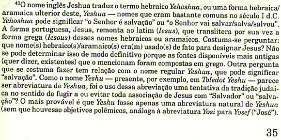 Observe-se inicialmente que não tem cabimento a afirmativa de que o nome Jesus é de origem grega e não hebraica. Esse nome, transliterado para o grego como Iesous, é hebraico e vem de Yeshua” (as aspas representam a letra ayin). A forma plena da palavra é Yehoshua”, que, a partir do Cativeiro, passou a dar lugar, geralmente, à forma abreviada Yeshua”.