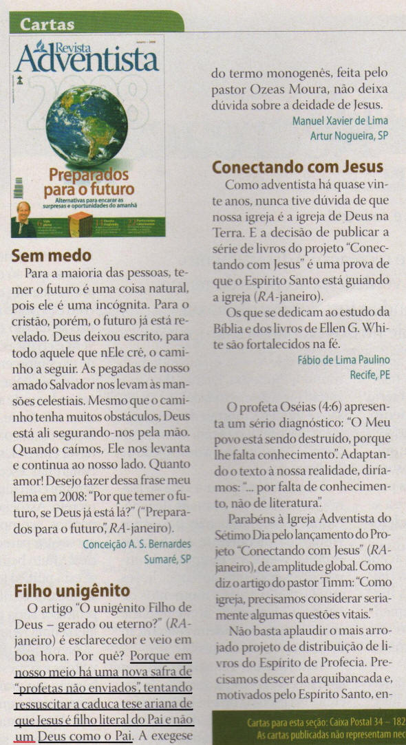 Confusão no Arraial Trinitariano: Manuel Xavier de Lima diz que "Jesus é UM Deus" e a Revista Adventista publica... Está na Seção de Cartas de Fevereiro, com o título "Filho Unigênito":