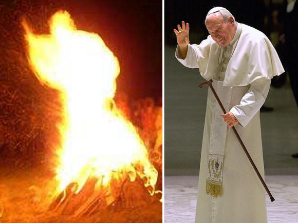 Papa, morto em 2005, está com a mão direita erguida, abençoando os católicos do
